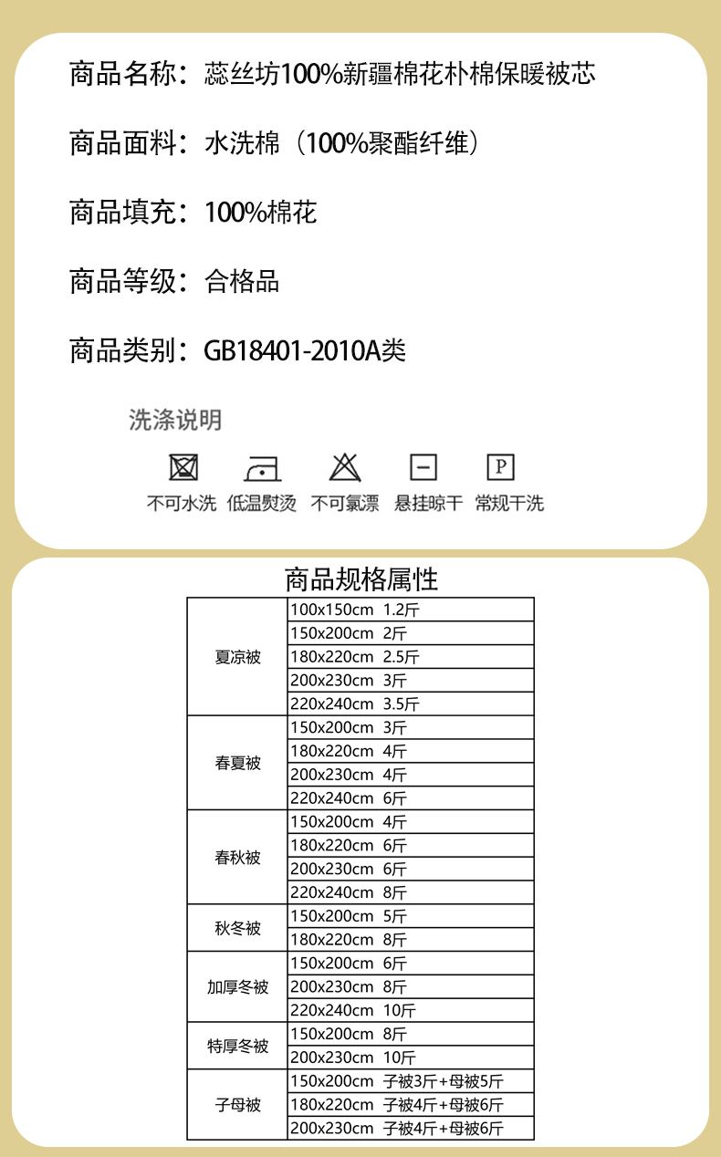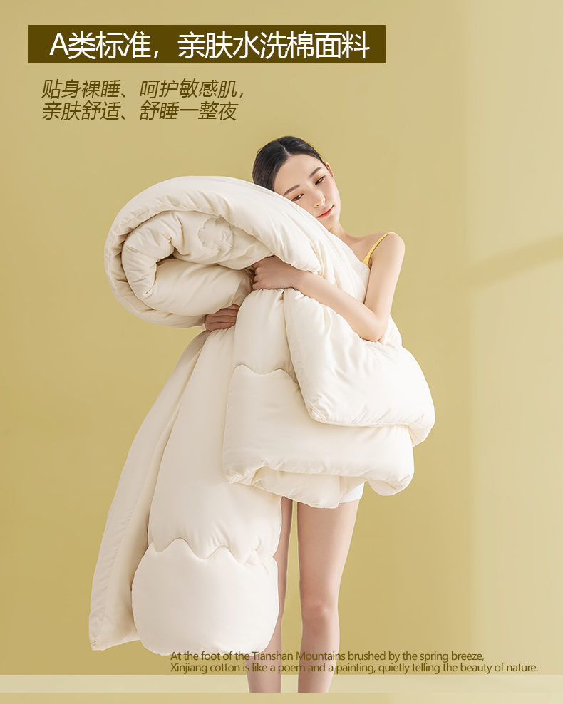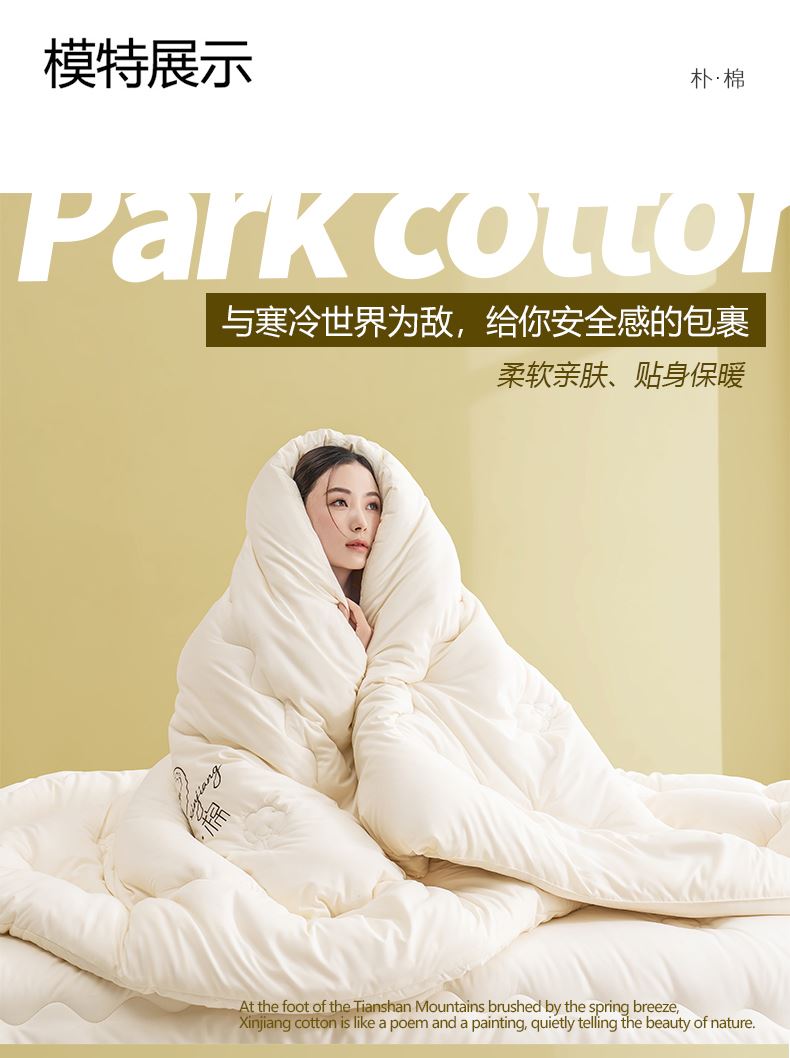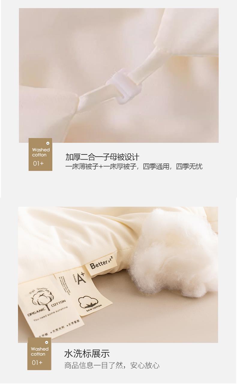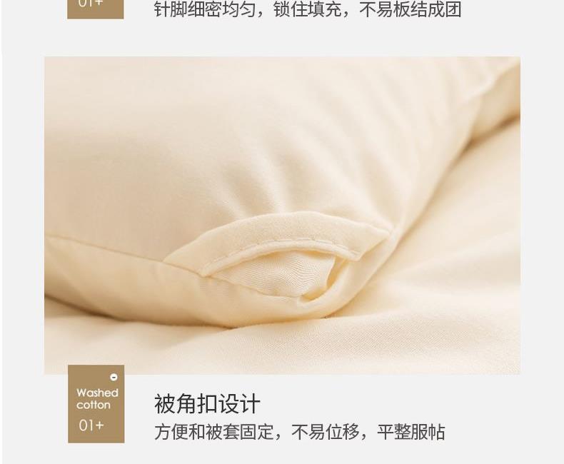 不會破洞 、 打結(jié)、 等問題 。精工藝棉花圖案,絎縫定位,穩(wěn)定棉,不斷棉,不跑棉,溫度均勻,針腳細密均勻,鎖住填充,不易板結(jié)。成團做了先進的清、消、殺、 烘、 等技術(shù)工藝,無異味 、 不變形。A類標準面料做的親膚水洗棉,水洗褶皺,貼身裸睡,呵護敏感肌,更加柔軟,包裹性更強,保暖 。人性化設(shè)計 增加四角背角扣,方便與被套固定,不易移位,平整服帖。