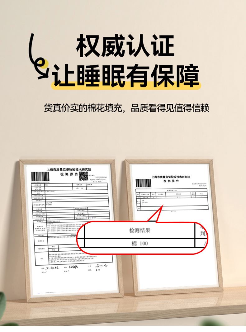 權(quán)威認證、(見質(zhì)檢報告) 貨真價實的棉花填充,品質(zhì)看得見值得信賴 。工藝 填充:超現(xiàn)代機器梳理 、整張棉 、
