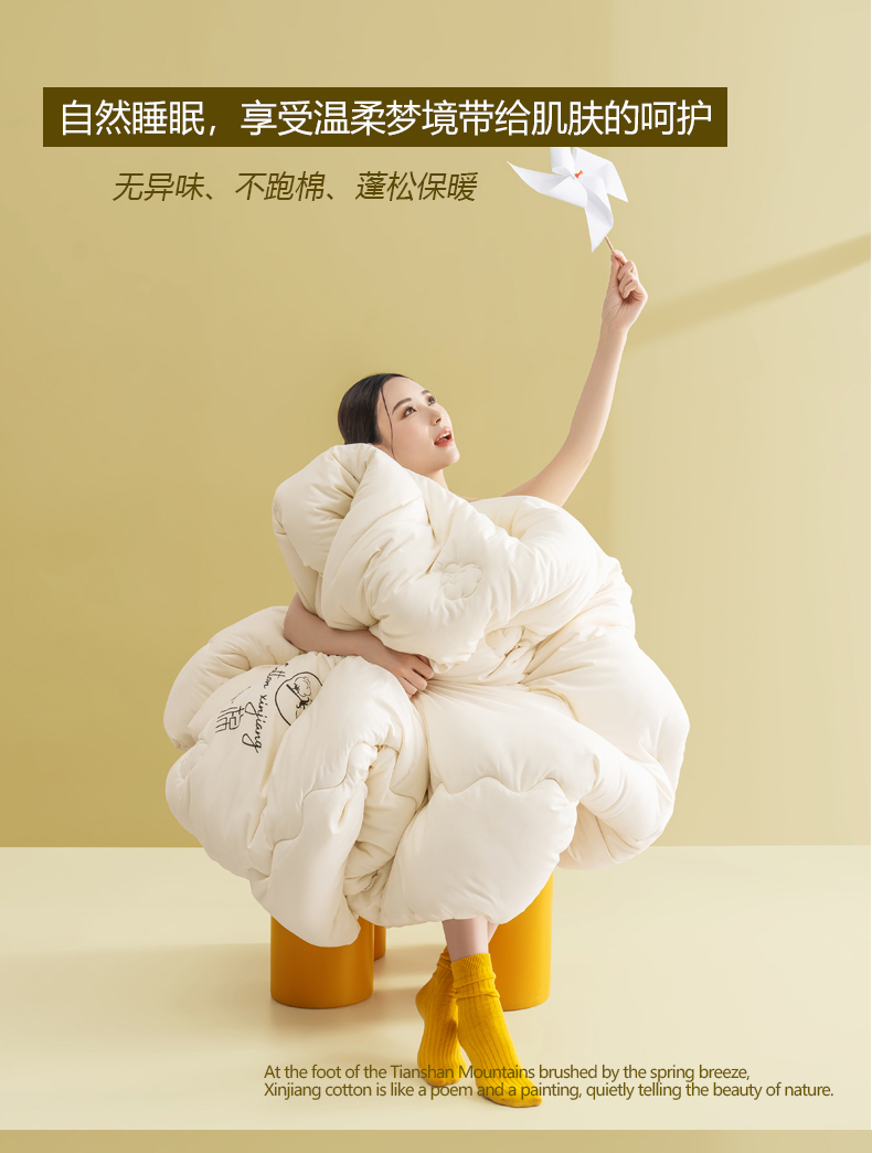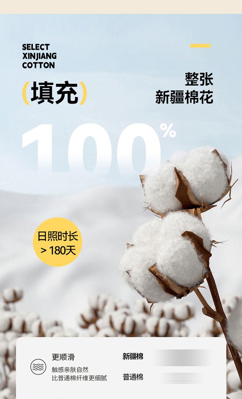 新疆棉花(整張新疆棉花),獨特的地理和氣候條件,使所產(chǎn)棉花纖維長、色澤好、品質(zhì)高、蓬松、柔軟、好眠。