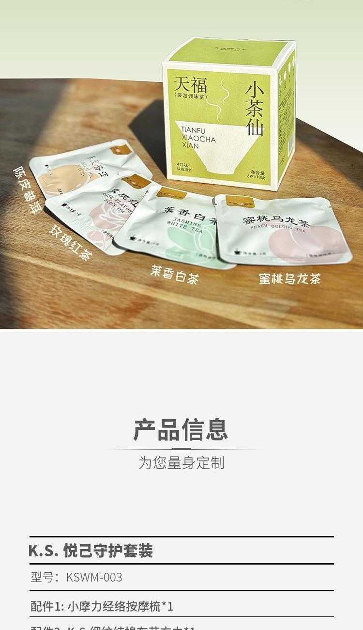 禮盒以悅己為主題,用清新明快的棉花插畫造型塑造了溫暖的調(diào)性。更適合員工福利、活動營銷等。 禮盒包含天福小茶仙、萌寵打咖杯、經(jīng)絡按摩梳、條紋方巾。 禮盒、內(nèi)容物件上均可實現(xiàn)中小批量成品訂制,全套訂制方案輸出,為企業(yè)宣傳添磚助力。 打咖杯/12.5*8.5CM 天福袋泡茶:3G*10包 按摩梳/11cmx7.3cmx4.5cm 方巾/34*34CM