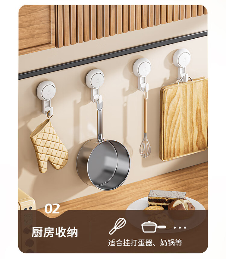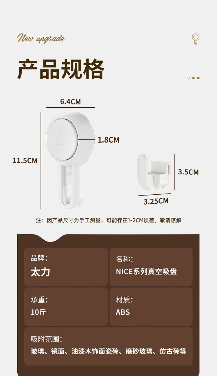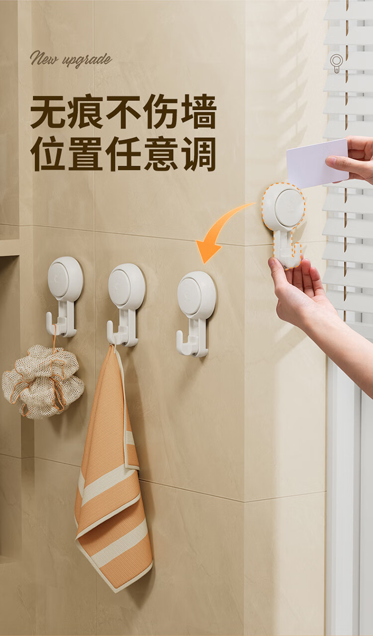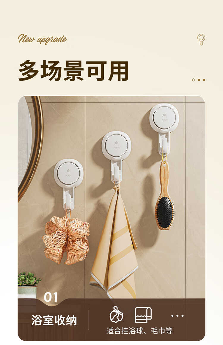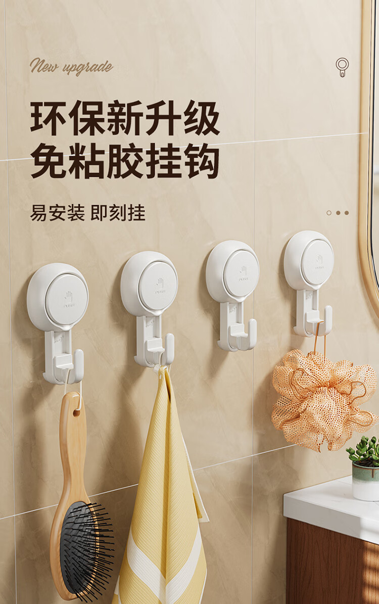 產品尺寸:11.5*6.4*4.2cm(4個) 承重:5KG 材質:真空吸盤TPE 適用墻面:光滑瓷磚,光滑玻璃,人工大理石,亞克力板 類別:掛鉤 適用場景:臥室,廚房,浴室 圖案:純色 功能:易操作,防水,真空吸附, 產品描述:環(huán)保新升級,免粘膠,循環(huán)用,真空吸附可移動,浴室使用防水,安裝簡單。