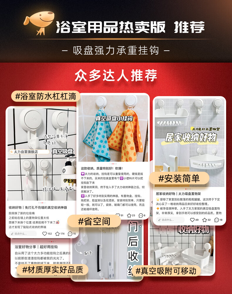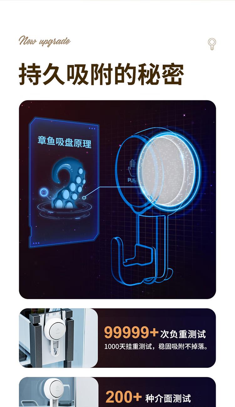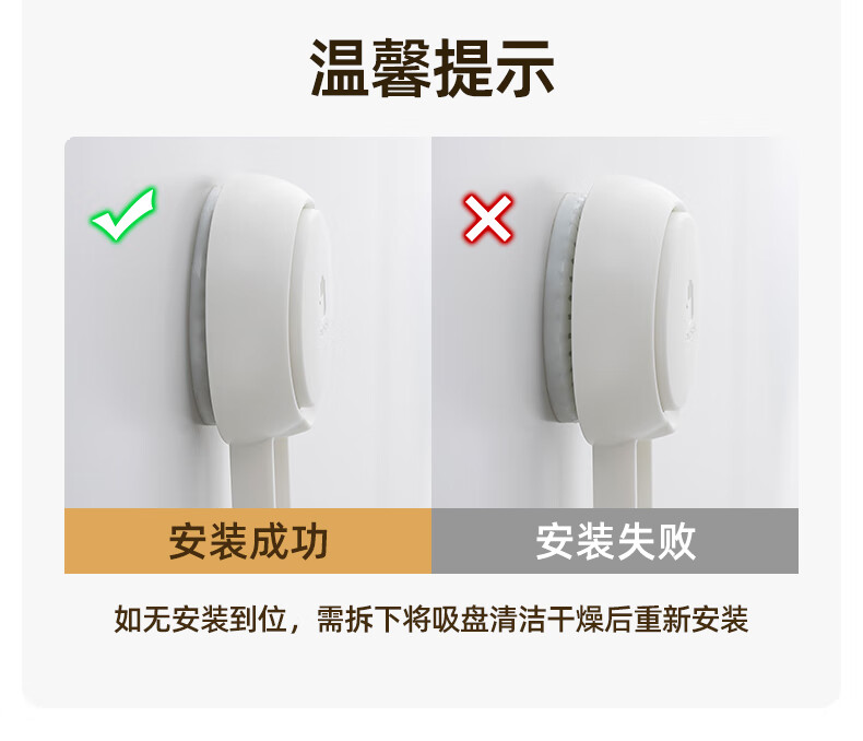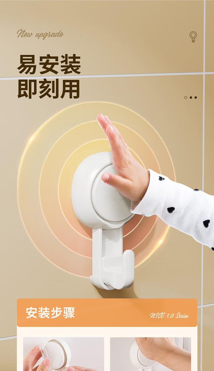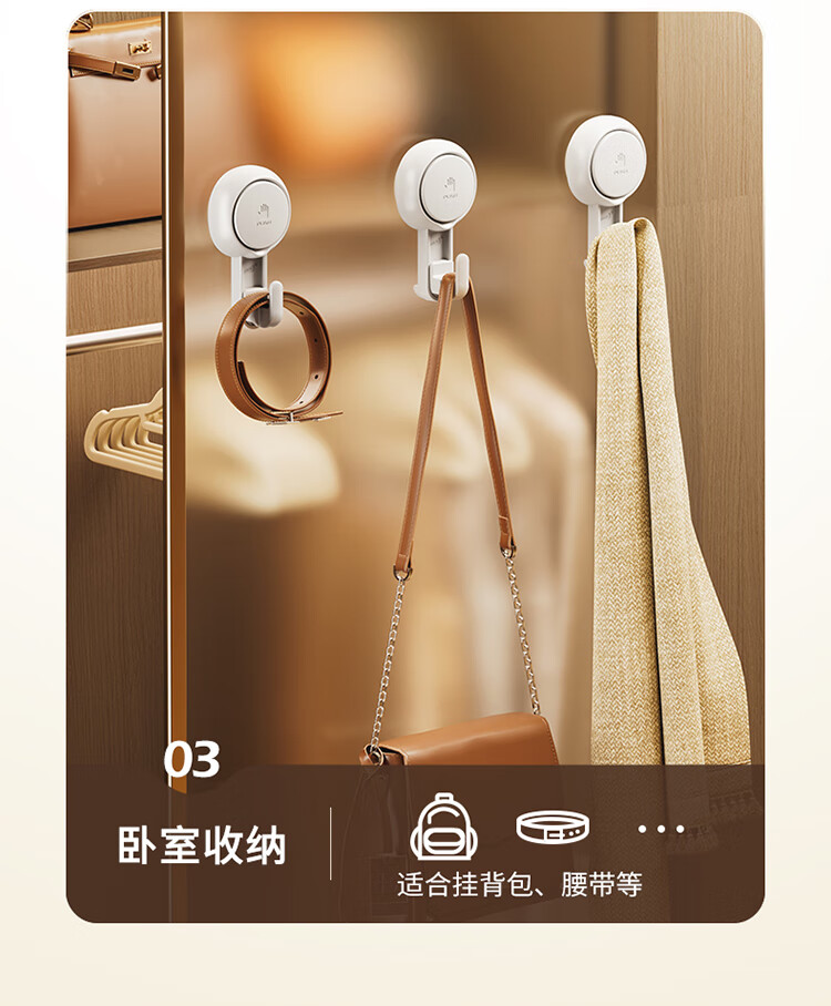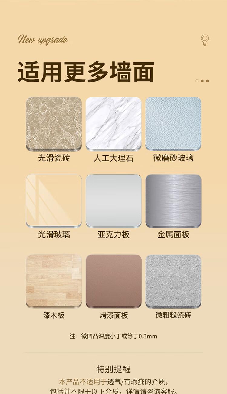 產品尺寸:11.5*6.4*4.2cm(4個) 承重:5KG 材質:真空吸盤TPE 適用墻面:光滑瓷磚,光滑玻璃,人工大理石,亞克力板 類別:掛鉤 適用場景:臥室,廚房,浴室 圖案:純色 功能:易操作,防水,真空吸附, 產品描述:環(huán)保新升級,免粘膠,循環(huán)用,真空吸附可移動,浴室使用防水,安裝簡單。