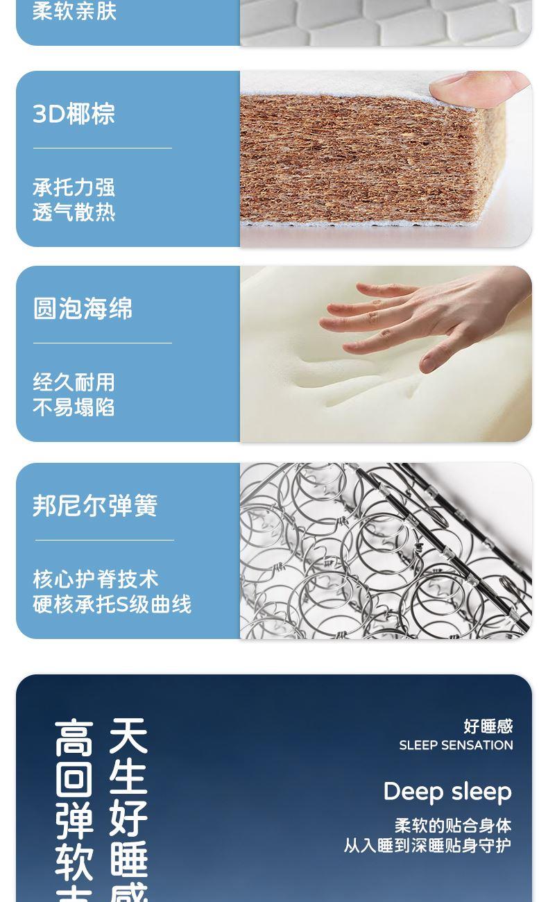 2.護脊支撐:采用邦尼爾彈簧和3D椰棕為主材,貼合亞洲人體型與脊椎結構,堅固耐壓,支撐護脊。