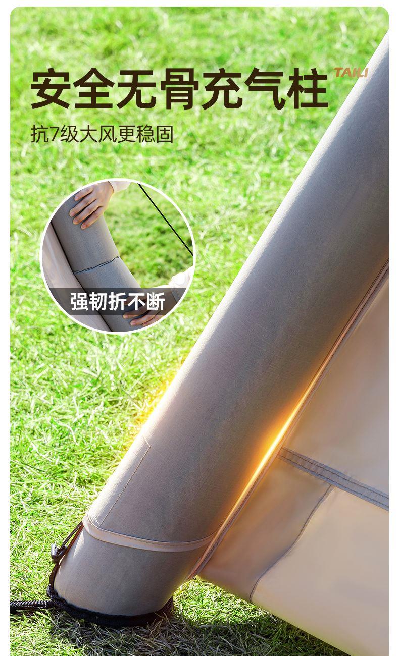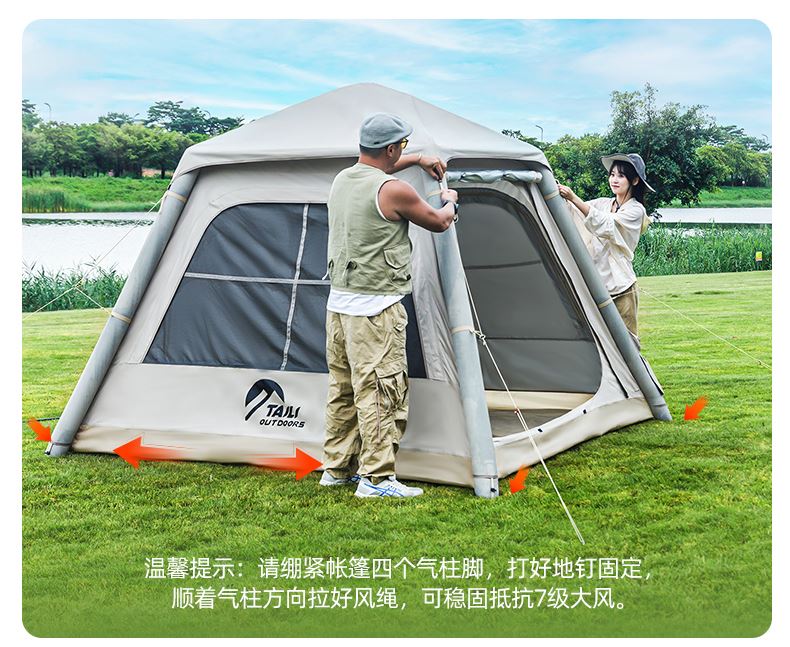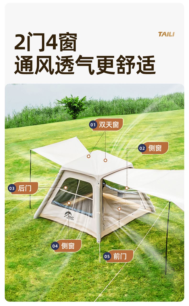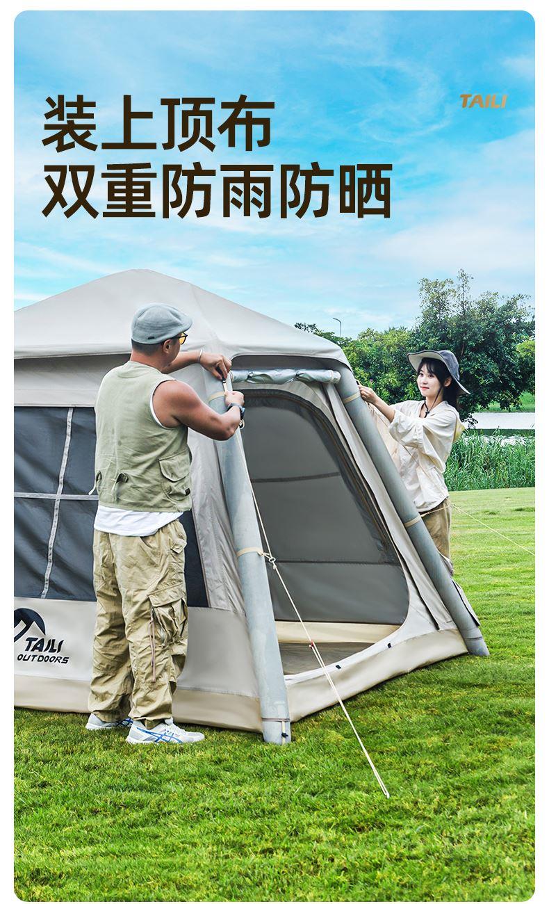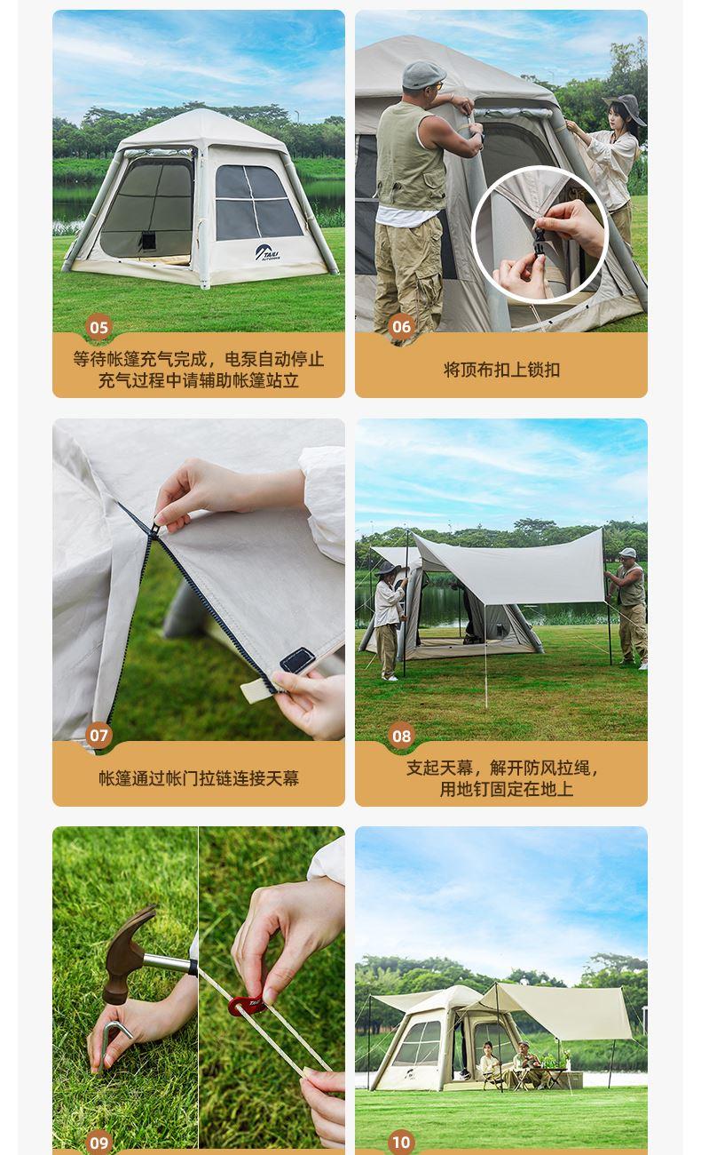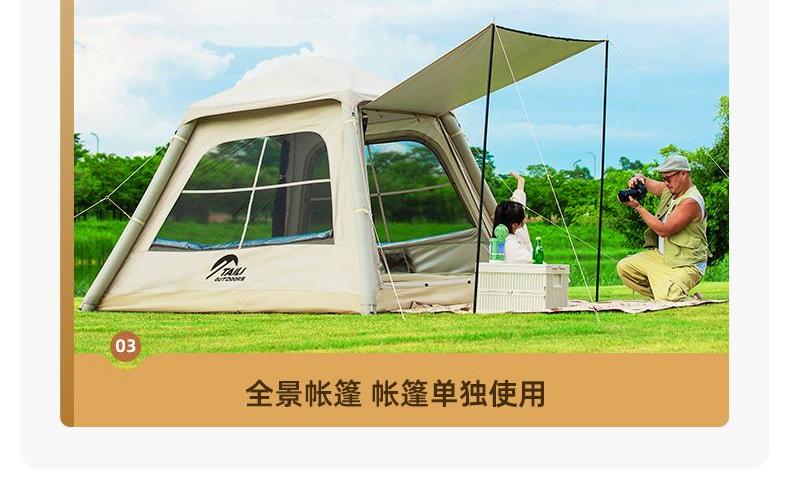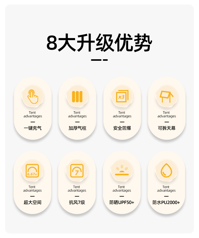 產(chǎn)品描述:一鍵自動充氣,約90s搭建完成,高強度TPU氣柱,抗風能力強,內(nèi)部空間寬敞。