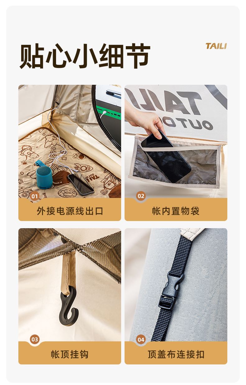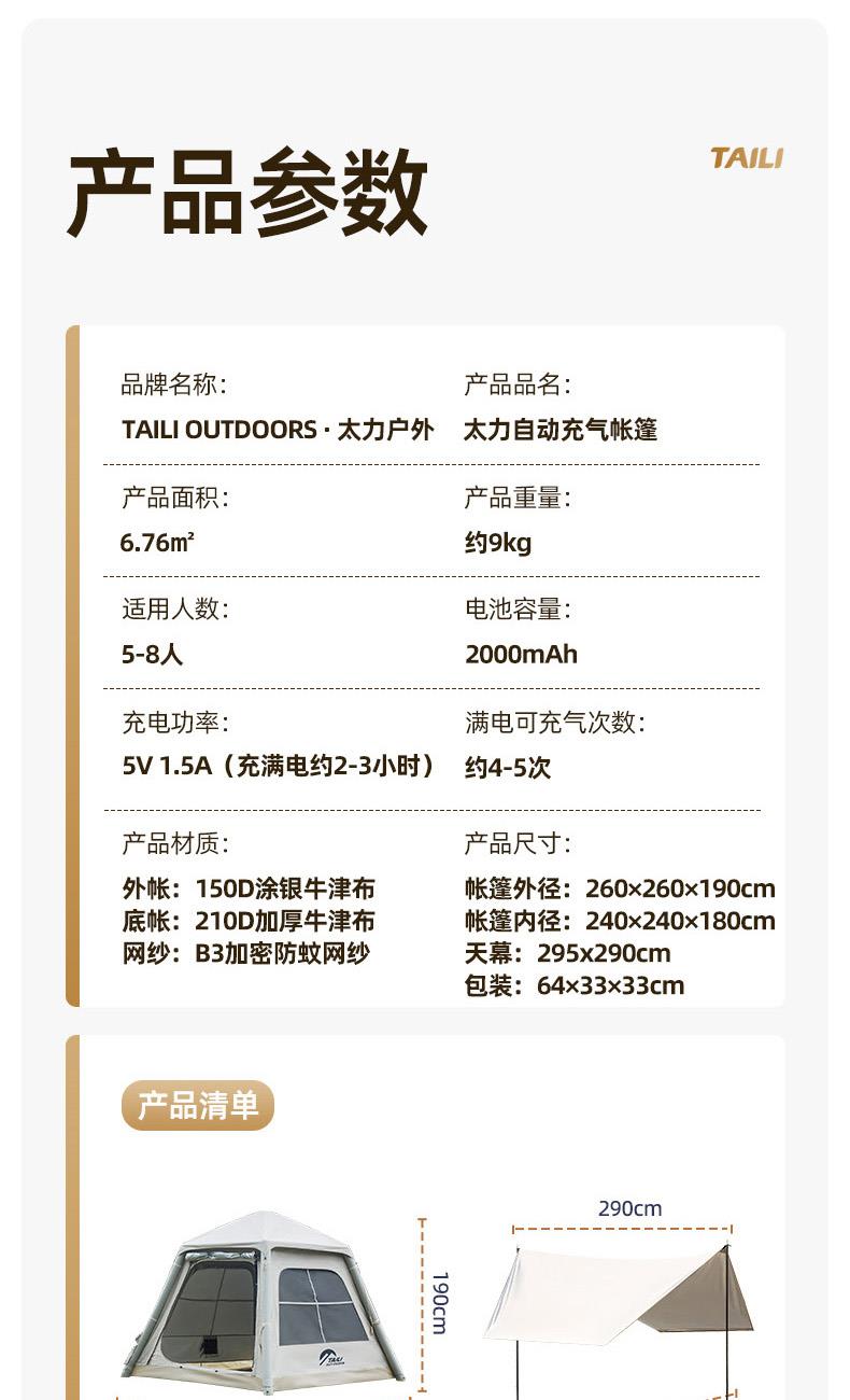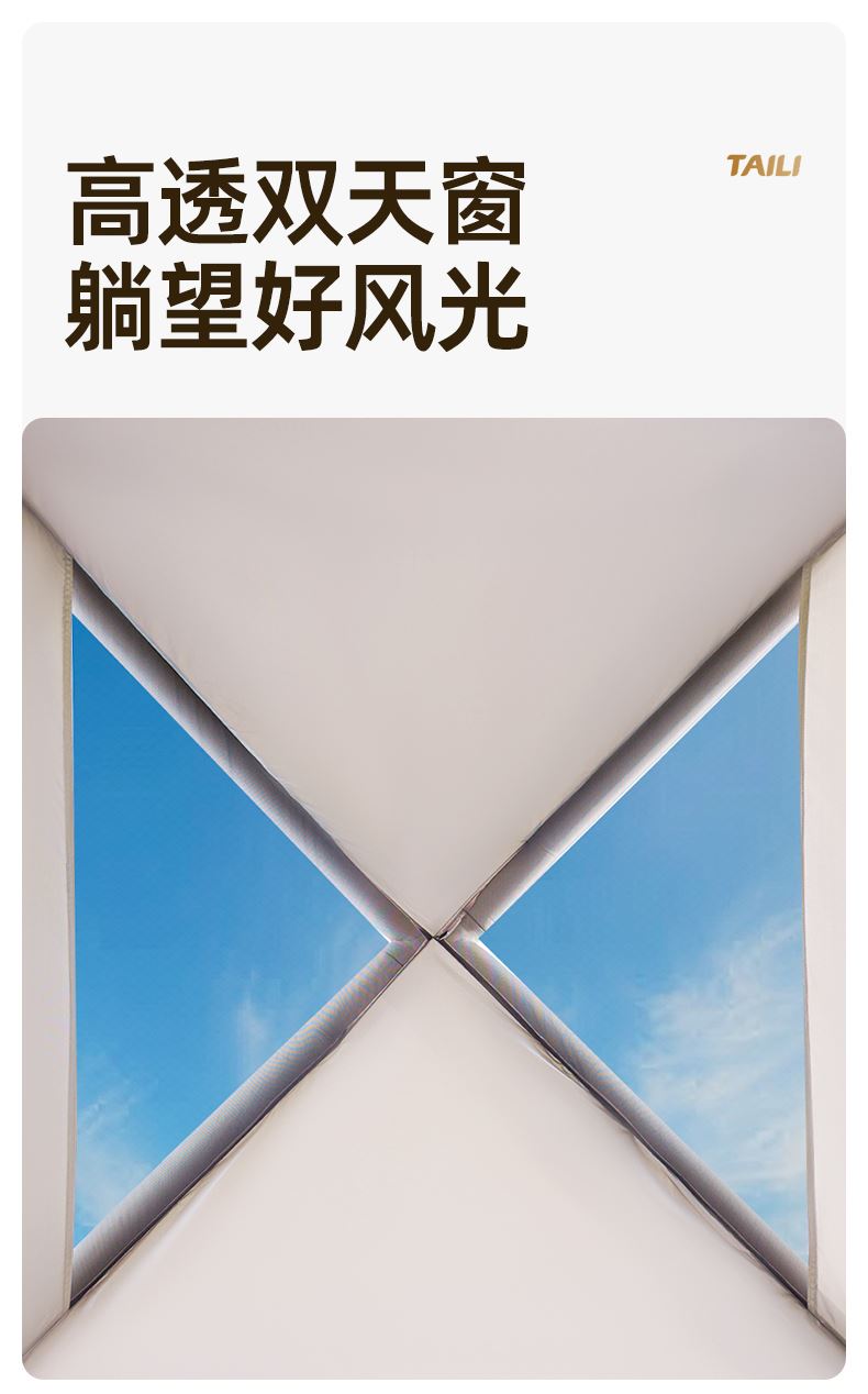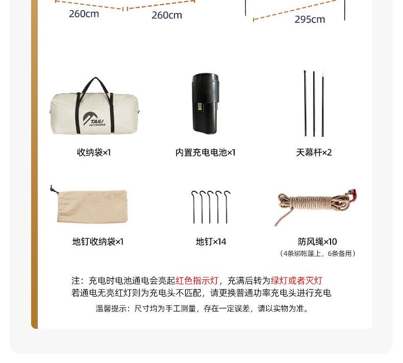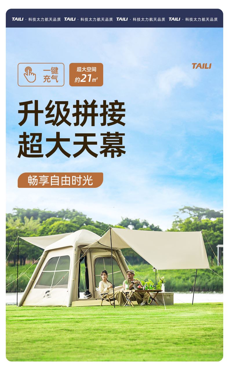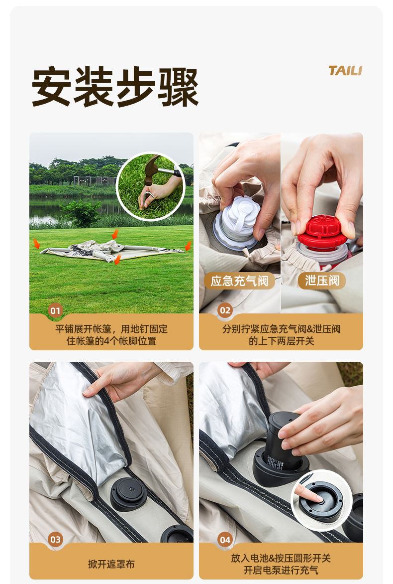 產(chǎn)品描述:一鍵自動充氣,約90s搭建完成,高強度TPU氣柱,抗風能力強,內(nèi)部空間寬敞。