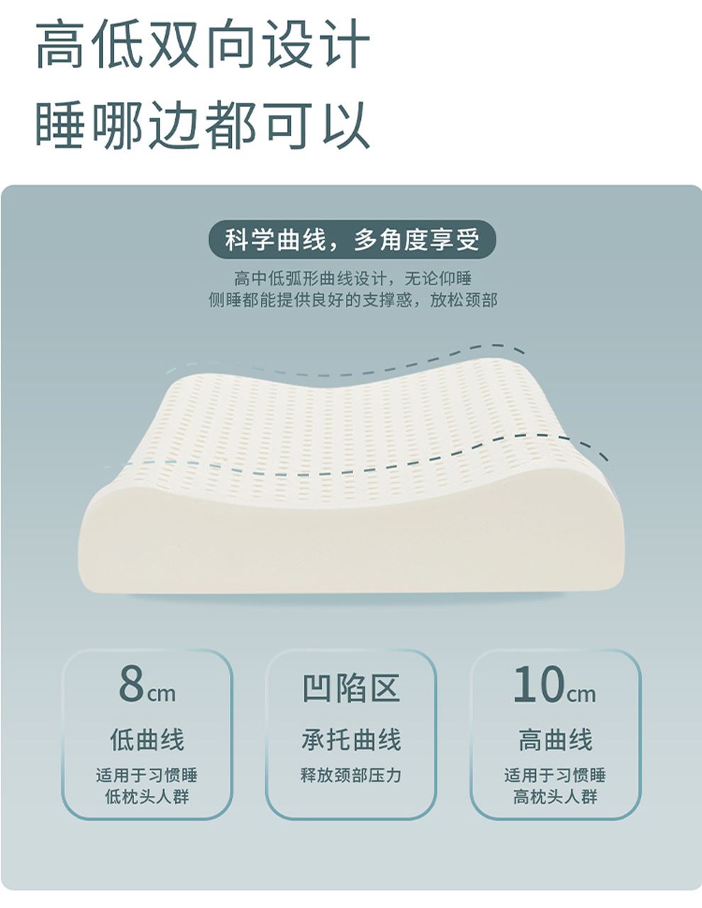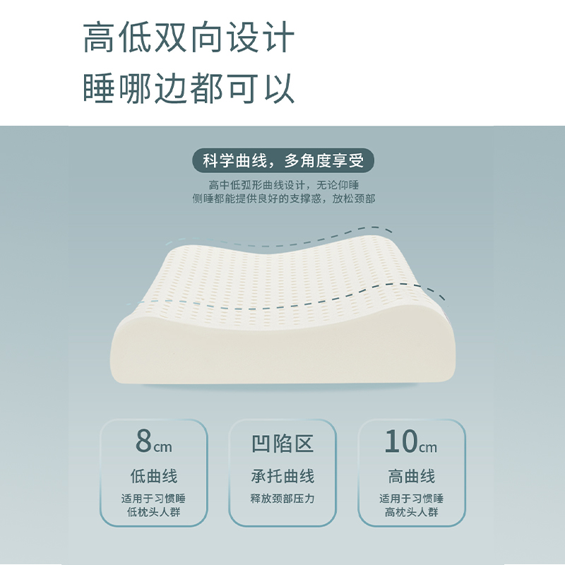 2.高低雙向設(shè)計:高中低弧形曲線設(shè)計,無論仰睡側(cè)睡都能提供良好的支撐惑,放松頸部