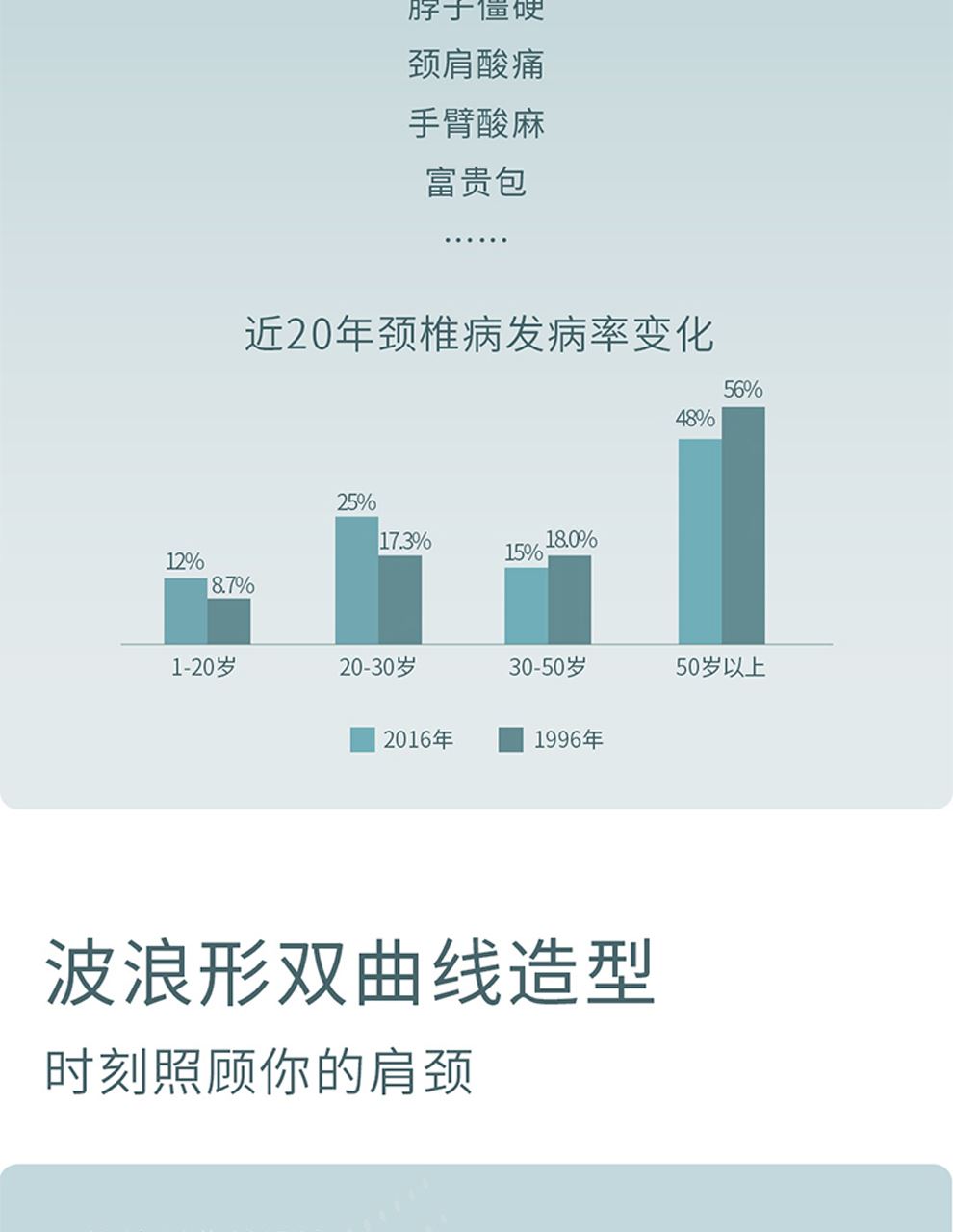 1.波浪形雙曲線造型:深度考量人體工程學(xué),任意角度都能貼合頸椎曲線,時刻照顧你的肩頸