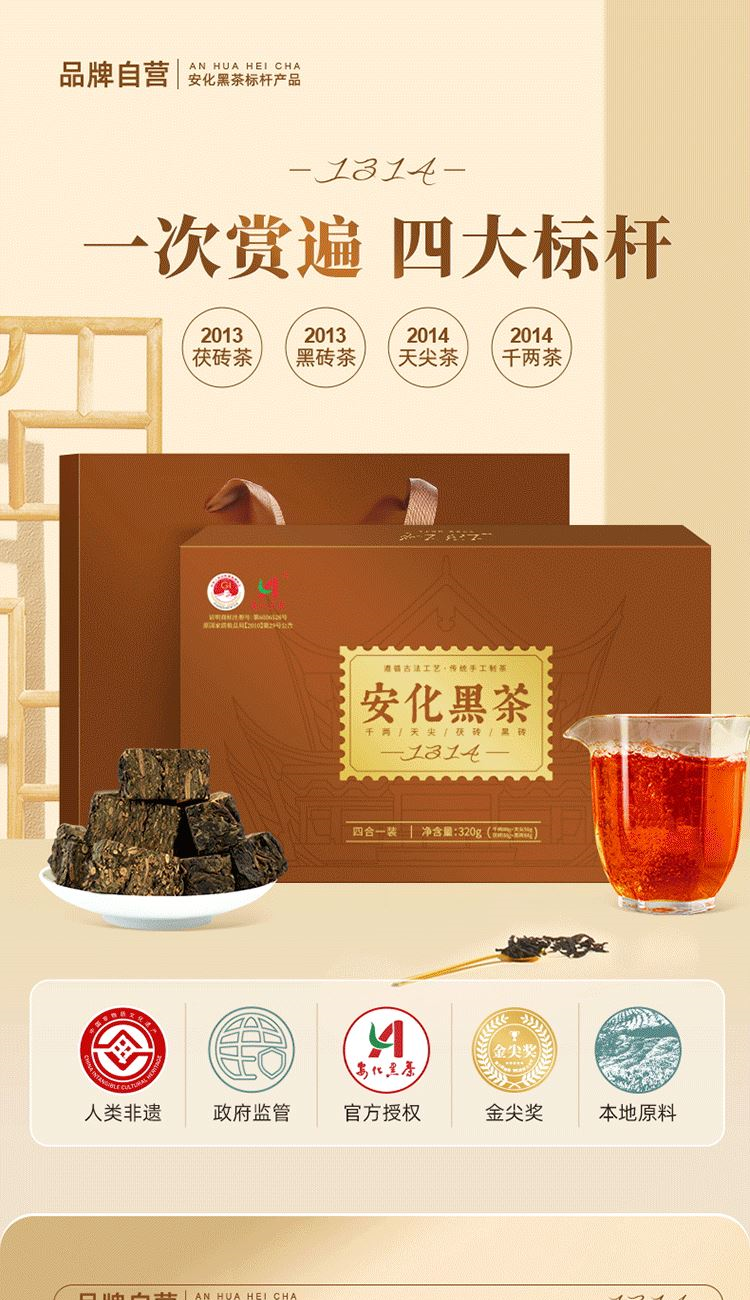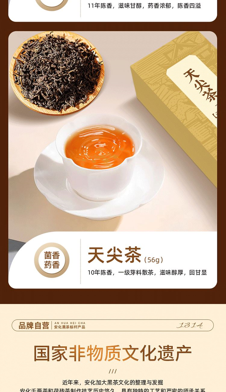①千兩:14年安化九龍池老料,由非遺傳統(tǒng)工藝壓制而成,金花密布,菌香濃郁,內(nèi)含物質(zhì)豐富,口感醇正甘潤(rùn),藥香;