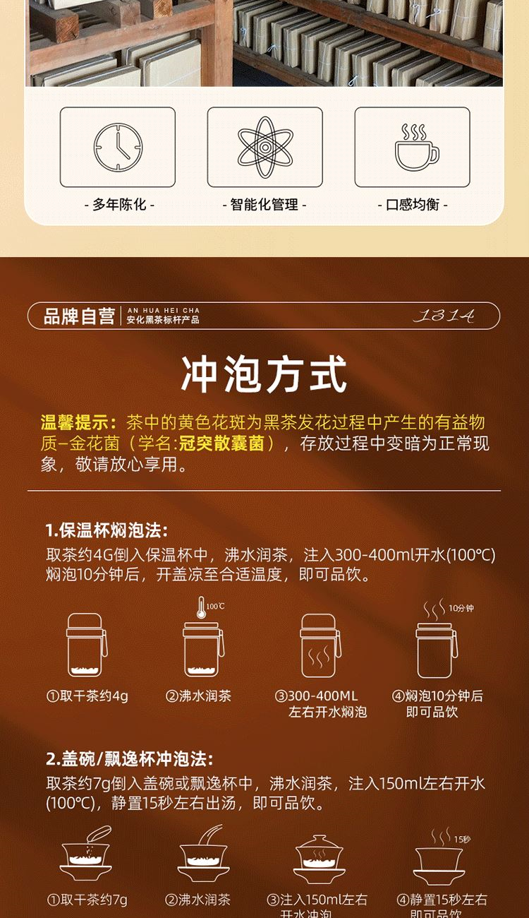 ④茯磚:13年安化芙蓉山老料,木倉(cāng)自然陳化,葉片油潤(rùn),金花密布,菌香濃郁,滋味醇正滑爽,有回甘;