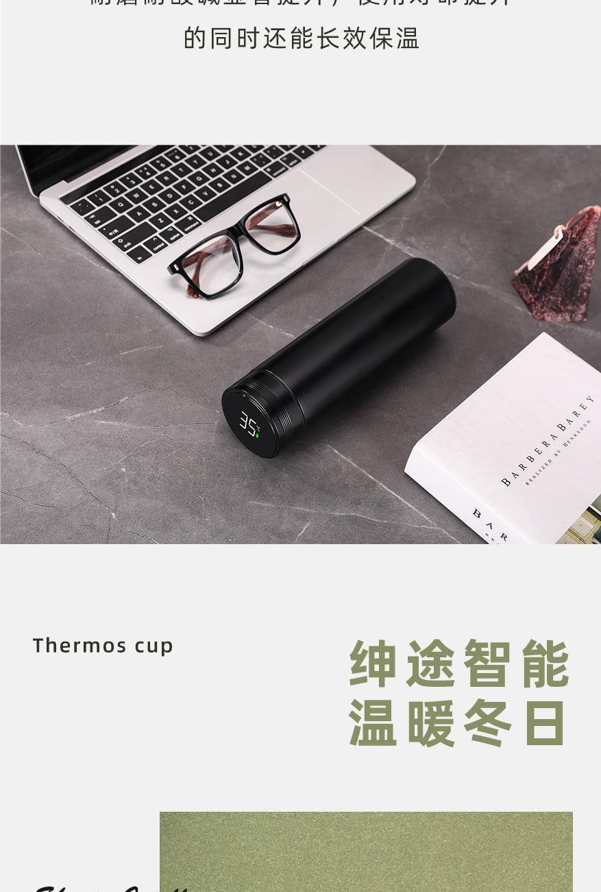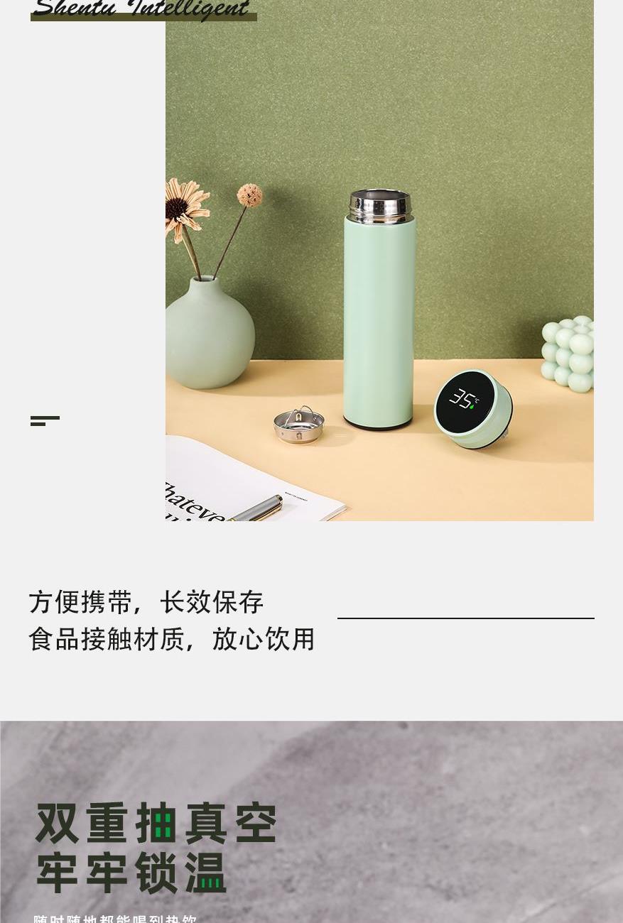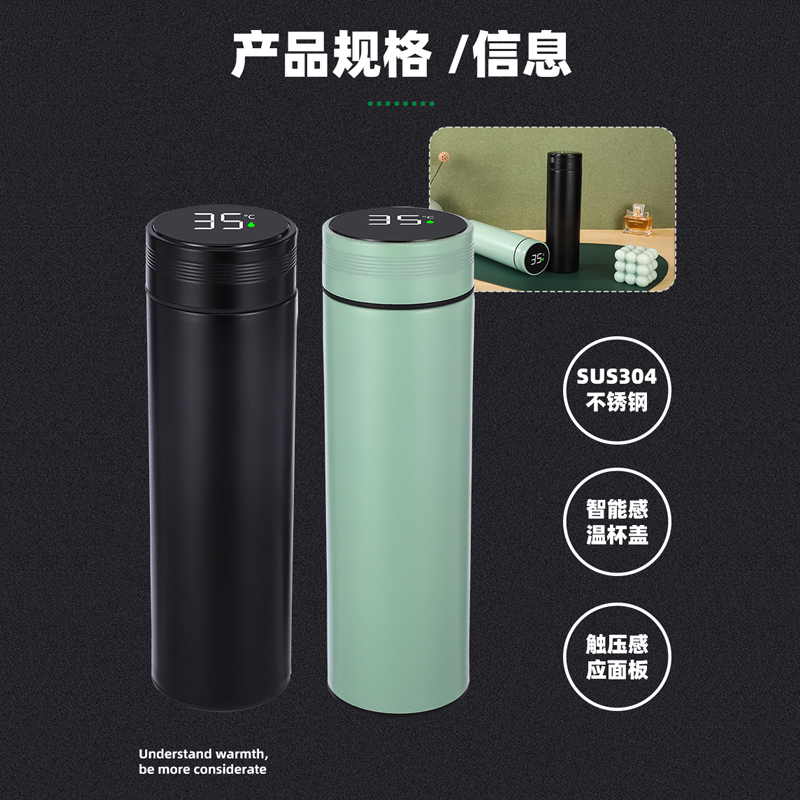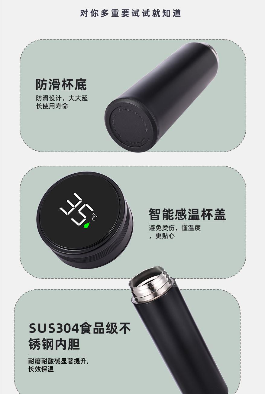 顏 色:黑色(綠色定制) 材 質(zhì):內(nèi)膽SUS304/杯蓋:食品級PP(聚丙烯)、硅膠 (食品接觸用) 容 量:500ml 彩盒尺寸:6.7*6.7*23cm 1、采用優(yōu)質(zhì)SUS304食品級不銹鋼內(nèi)膽,耐磨耐酸堿顯著提升,使用壽命提升的同時還能長效保溫; 2、智能感溫杯蓋,告別嘴唇試溫,避免燙傷,懂溫度,更貼心 ; 3、LED顯示屏,觸壓感應(yīng)面板,大容量電池,無需充電。