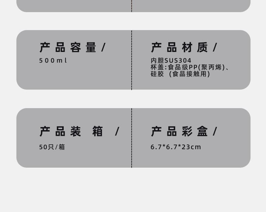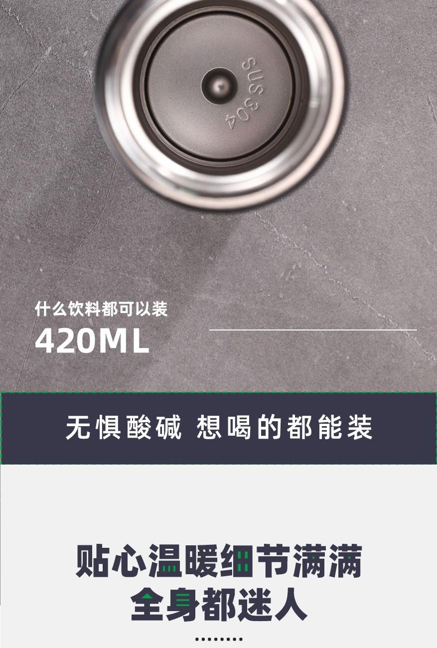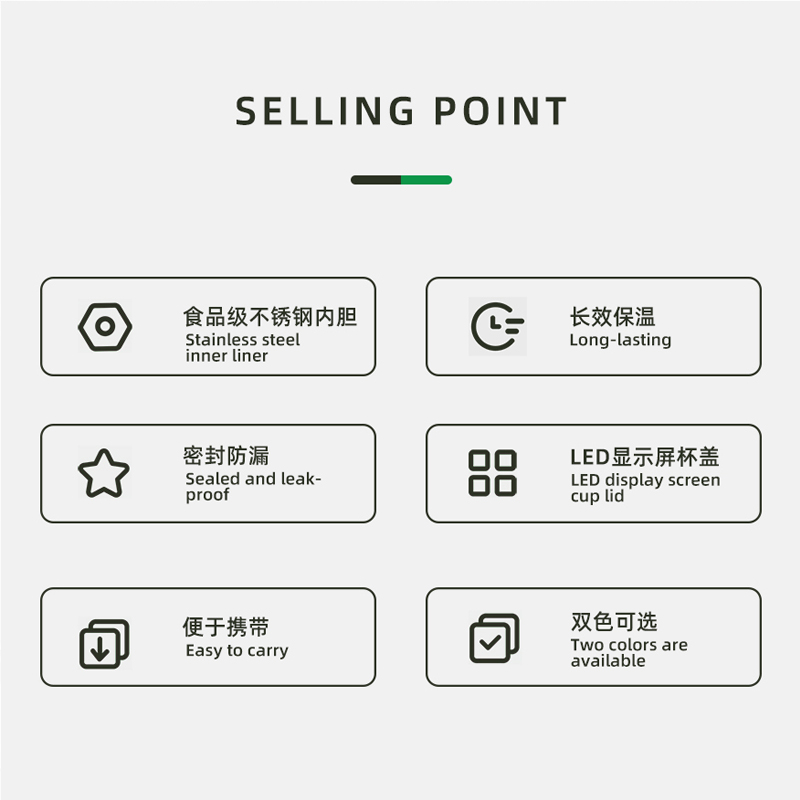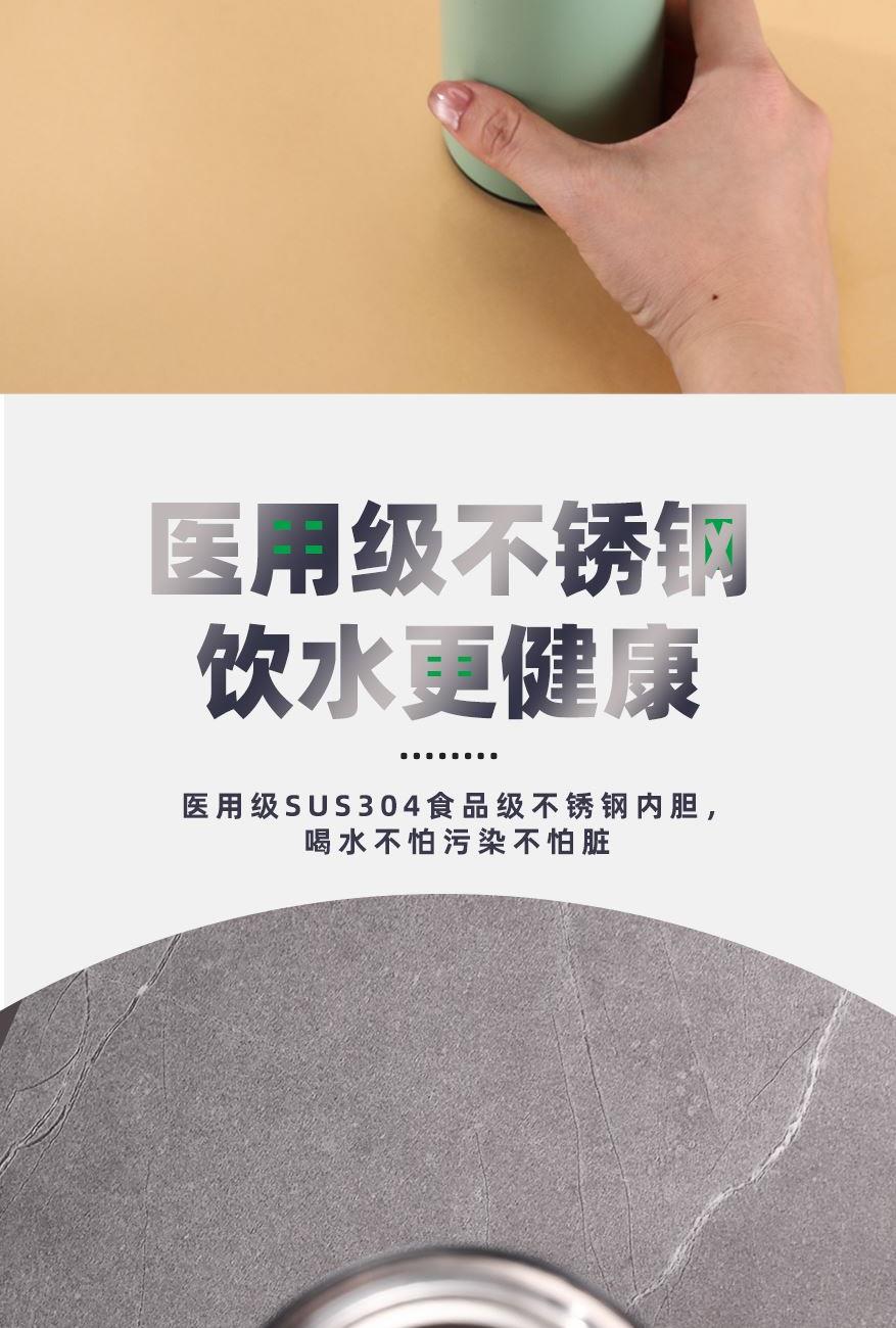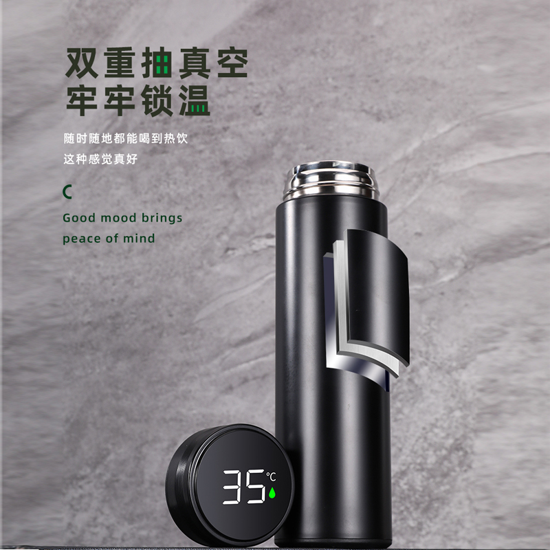 顏 色:黑色(綠色定制) 材 質(zhì):內(nèi)膽SUS304/杯蓋:食品級PP(聚丙烯)、硅膠 (食品接觸用) 容 量:500ml 彩盒尺寸:6.7*6.7*23cm 1、采用優(yōu)質(zhì)SUS304食品級不銹鋼內(nèi)膽,耐磨耐酸堿顯著提升,使用壽命提升的同時還能長效保溫; 2、智能感溫杯蓋,告別嘴唇試溫,避免燙傷,懂溫度,更貼心 ; 3、LED顯示屏,觸壓感應(yīng)面板,大容量電池,無需充電。