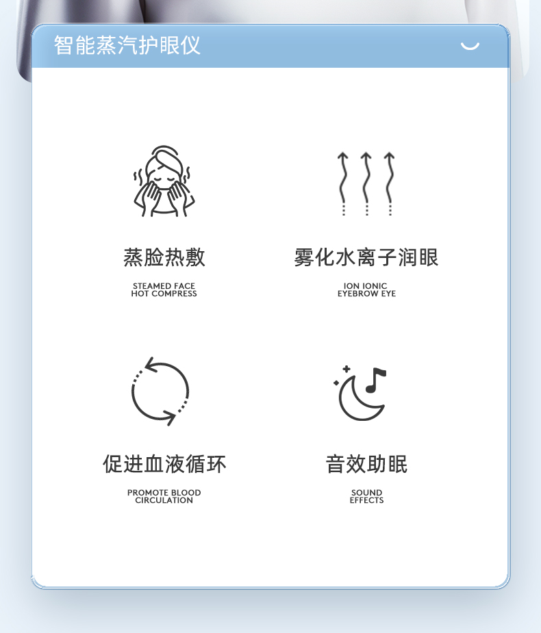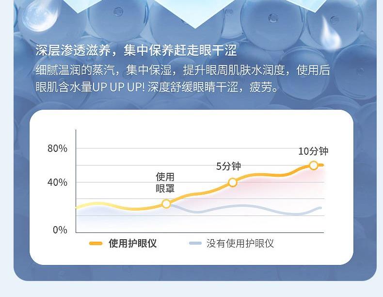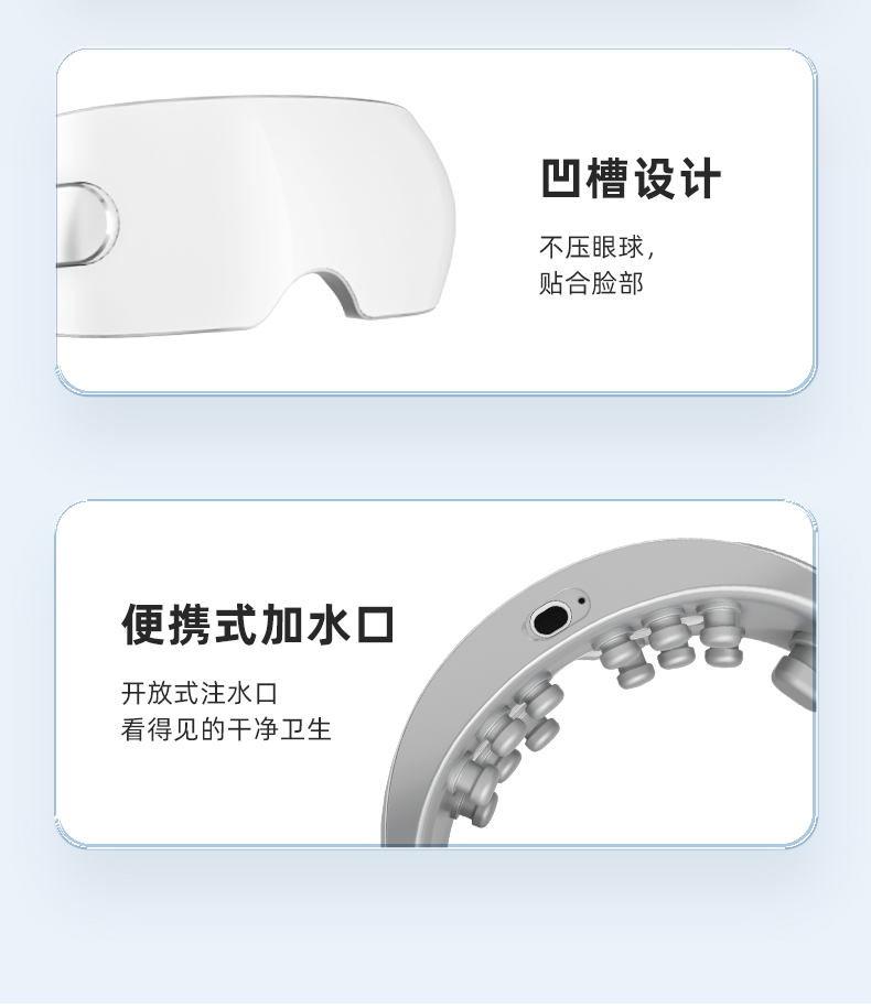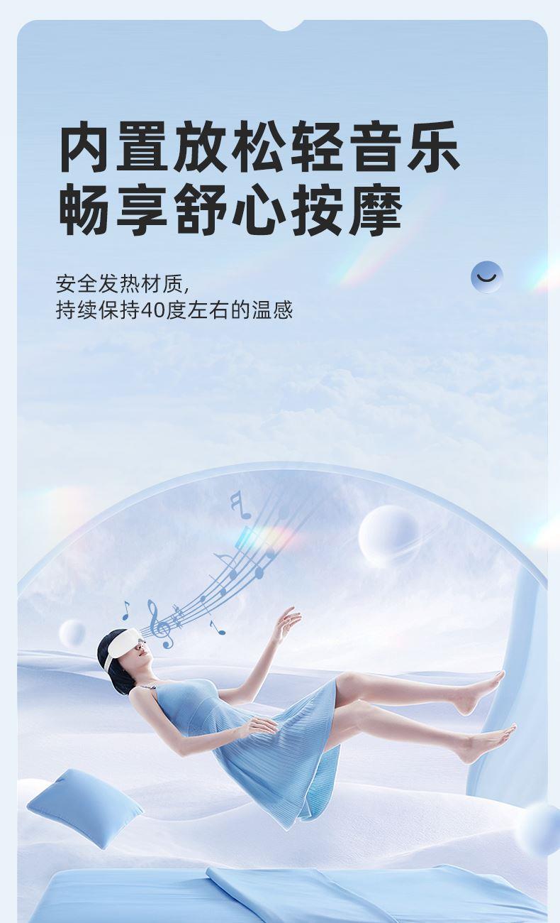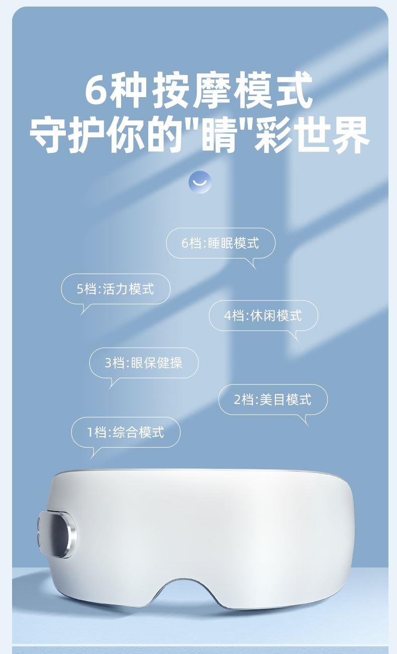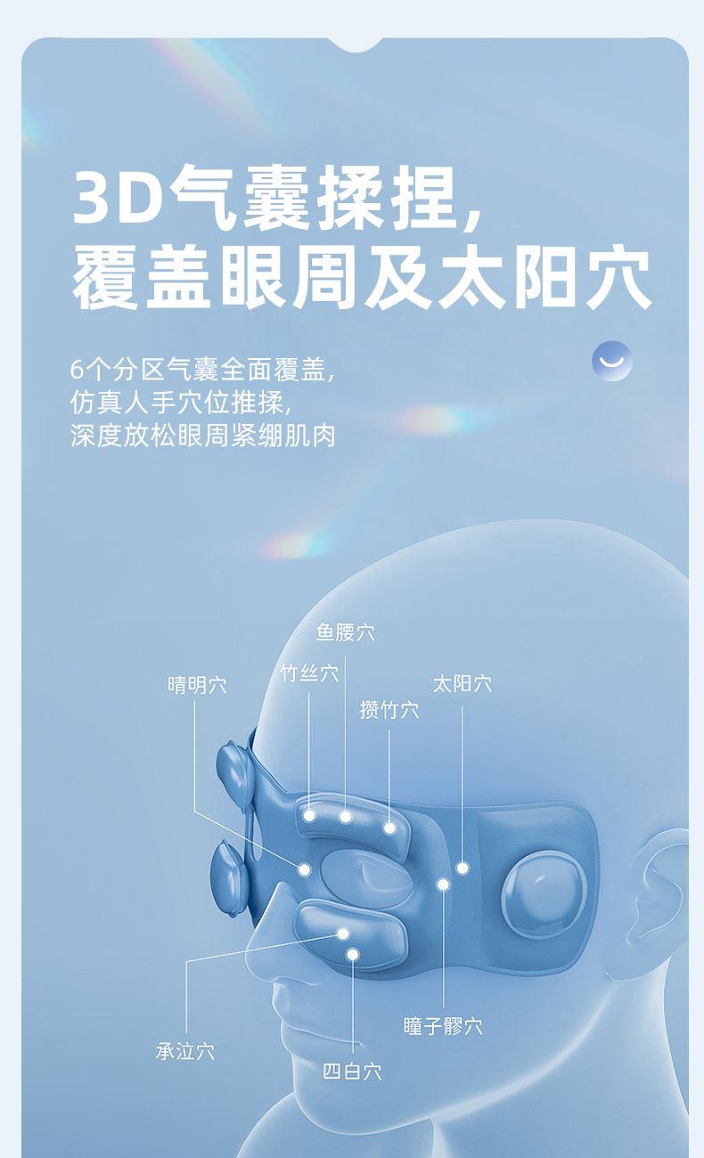 1.3D立體包裹式按摩,舒享眼部SPA; 2.傳統(tǒng)+現(xiàn)代科技結(jié)合,橫掃雙眼疲勞; 3.6個分區(qū)氣囊全面覆蓋仿真人手穴位推揉,深度放松眼周緊繃肌肉; 4.安全發(fā)熱材質(zhì),持續(xù)保持40度左右的溫感; 5.納米霧化蒸汽+高頻拍打按摩,鎖水保濕 層層滲透輕松潤眼釋壓; 6.6種按摩模式守護你的"睛"彩世界;