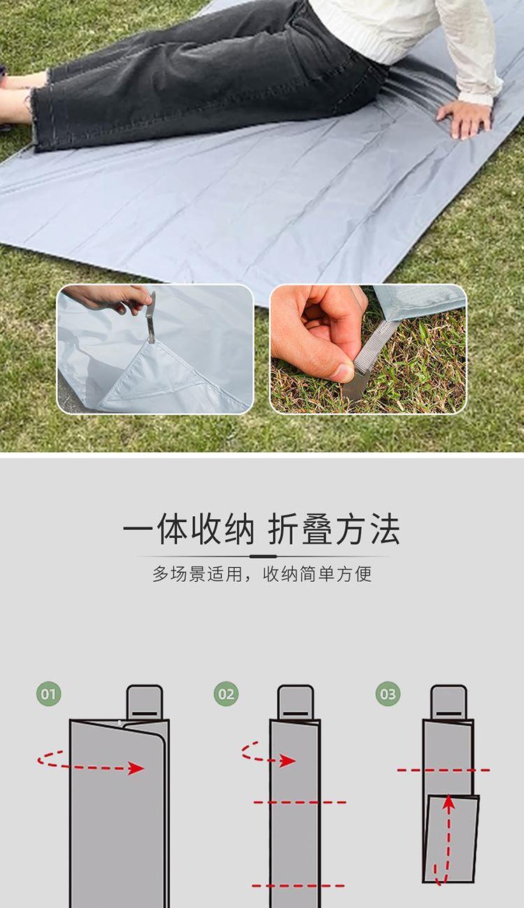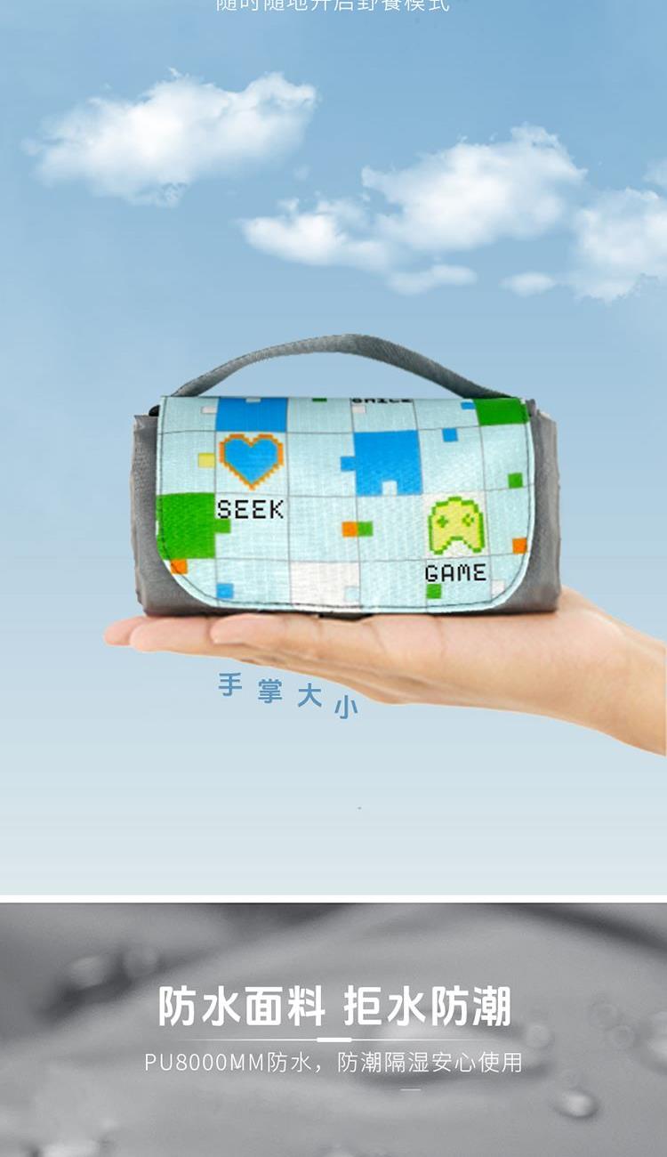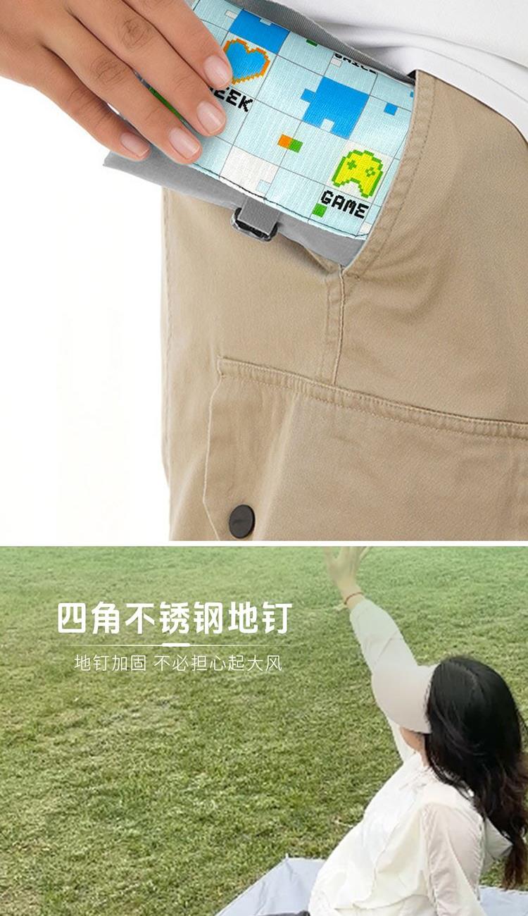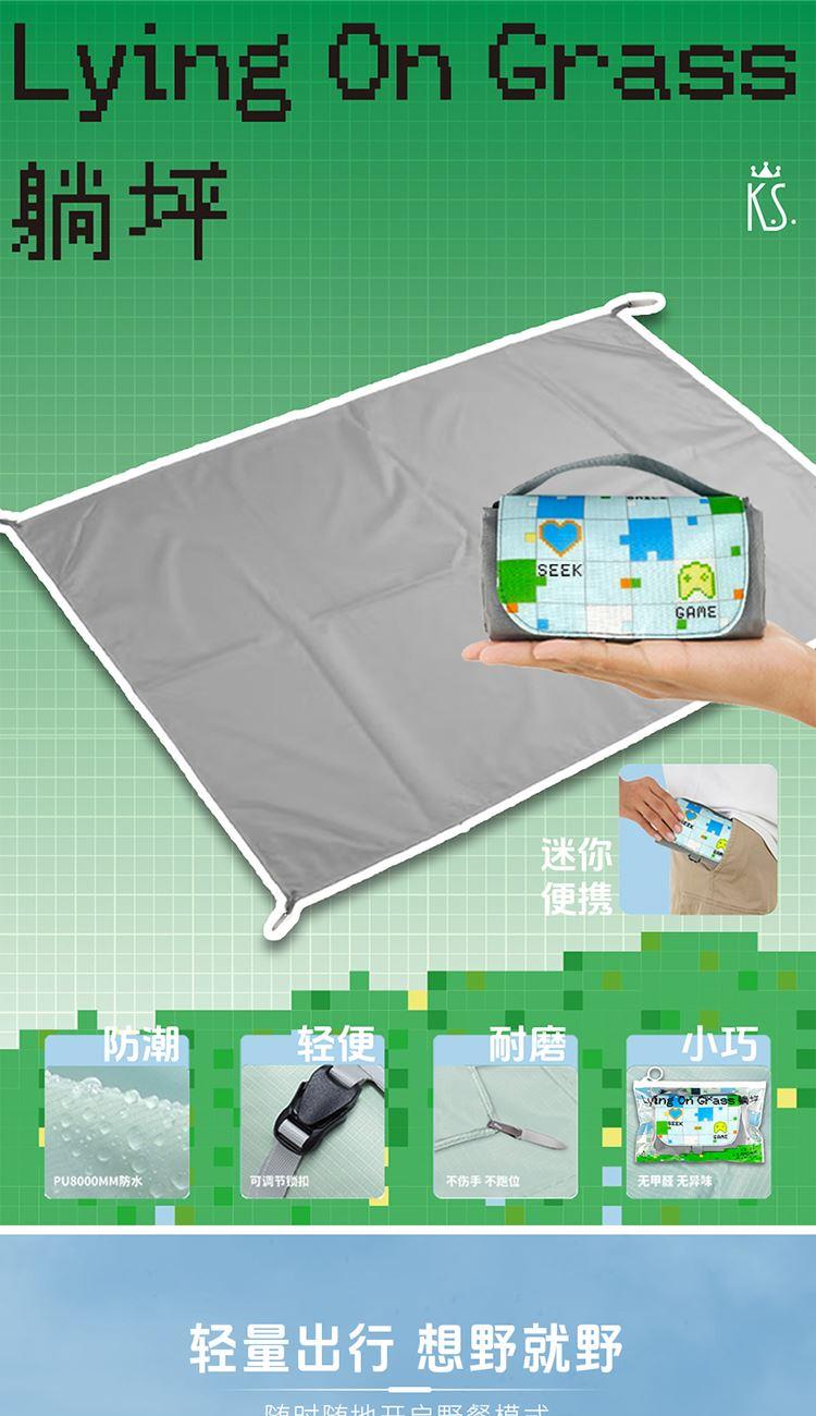 1.輕量,輕松收納: 210T高密滌塔夫面料,自重輕盈,折疊后僅巴掌大小,輕松攜帶。 2.210T滌塔夫面料防水防污: 有效抵御地面濕氣.潑濺和小雨,污漬易擦除,保持墊面干爽潔凈。 3.四角加固地釘設(shè)計: 自帶4枚地釘,強風(fēng)天氣穩(wěn)固抗風(fēng),告別墊子亂飛煩惱。 4.年輕化設(shè)計風(fēng)格: 像素搭配純色,更顯活力。戶外打卡更出片,彰顯個性品味。 210T防水滌塔夫
