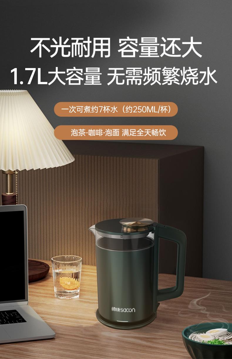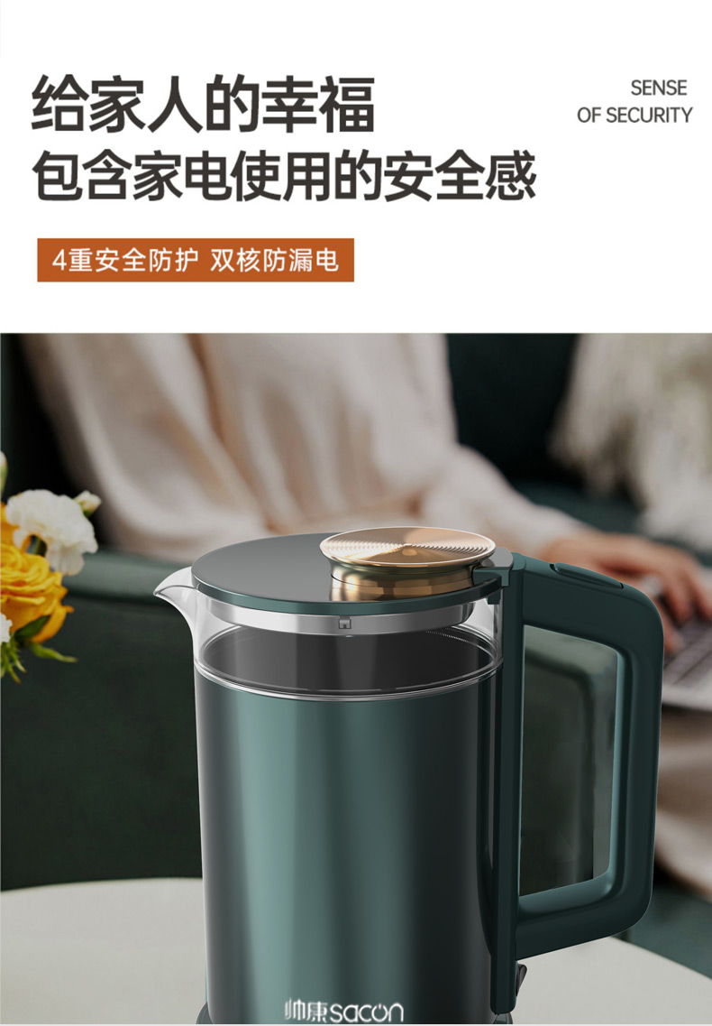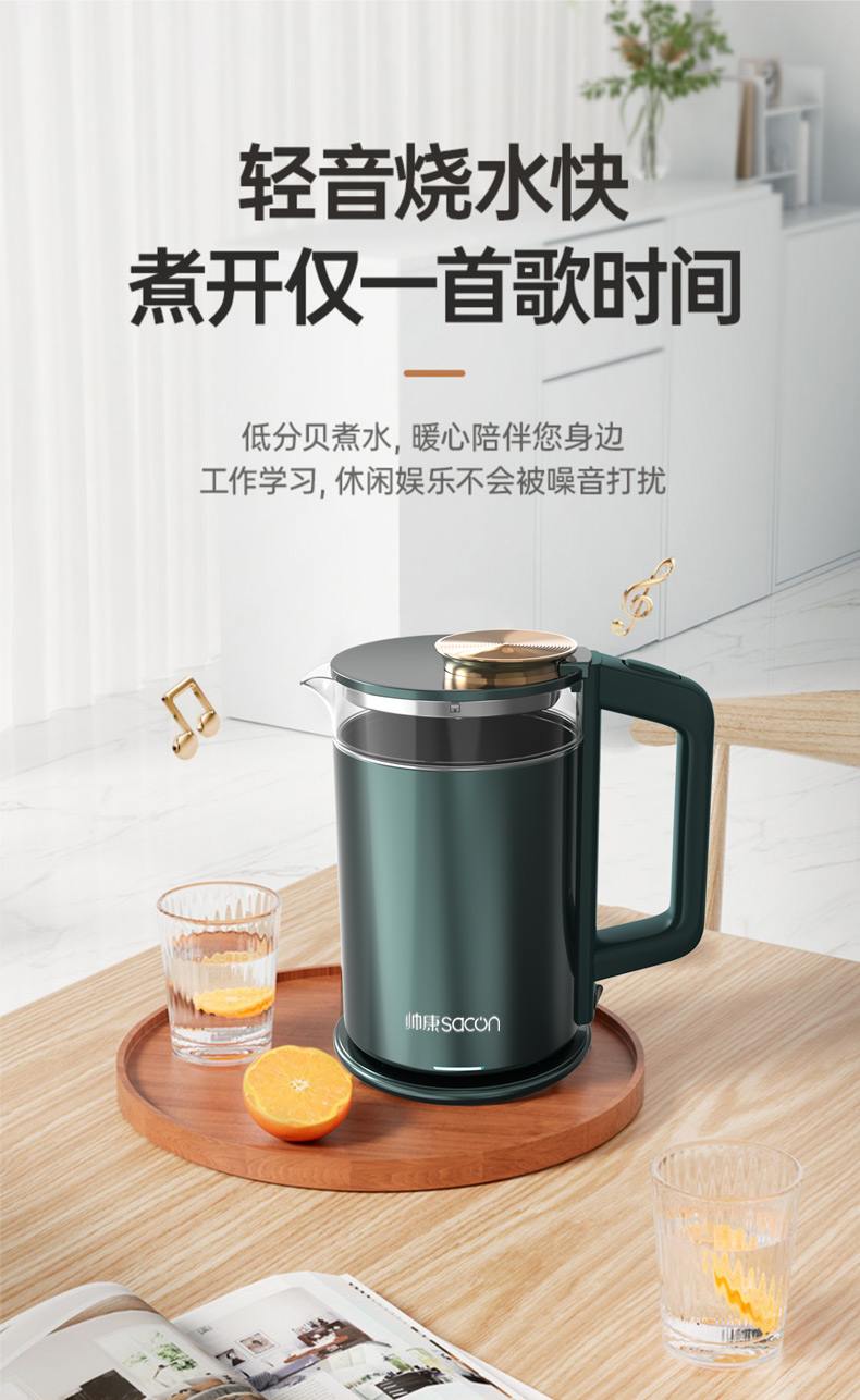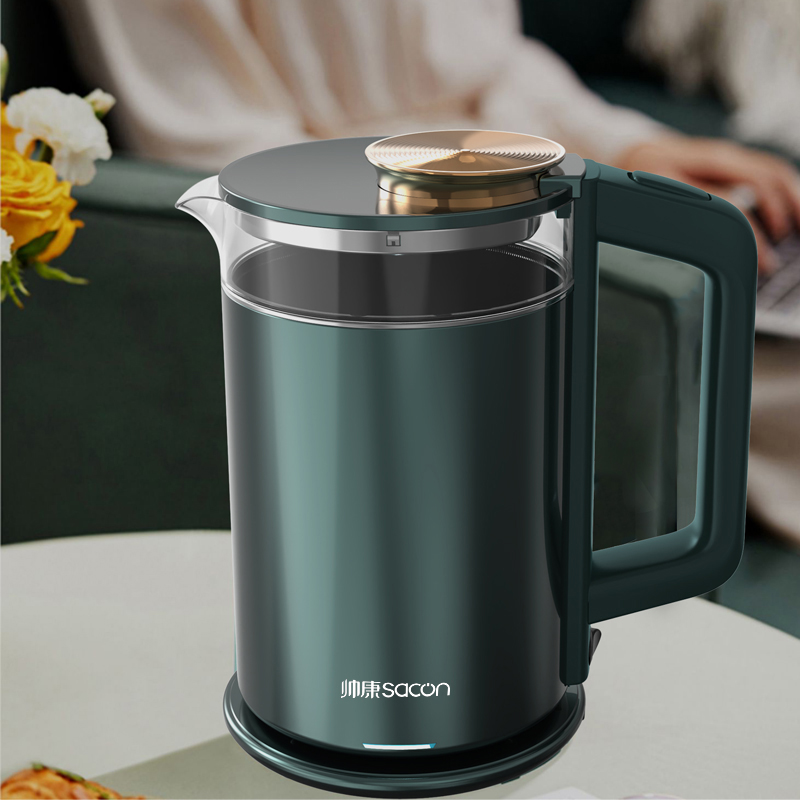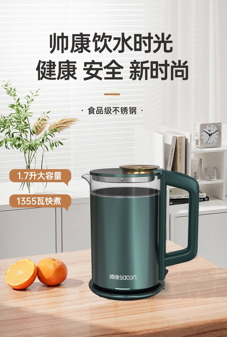 認(rèn)證型號:SSGL-17AL 顏色:綠色系 容量:1.7L 適用場景:家用 額定功率:1355W 類型:電熱水壺 特征特質(zhì):雙層防燙 功能:自動斷電防干燒