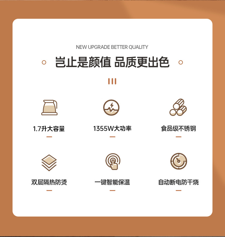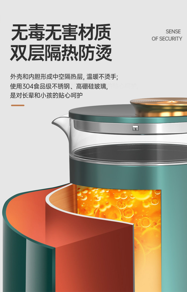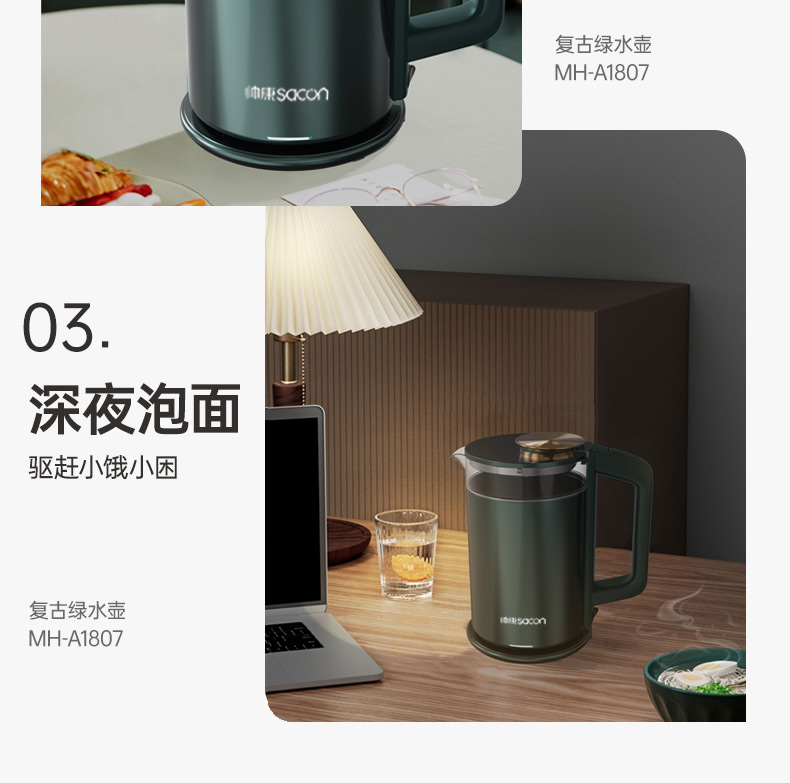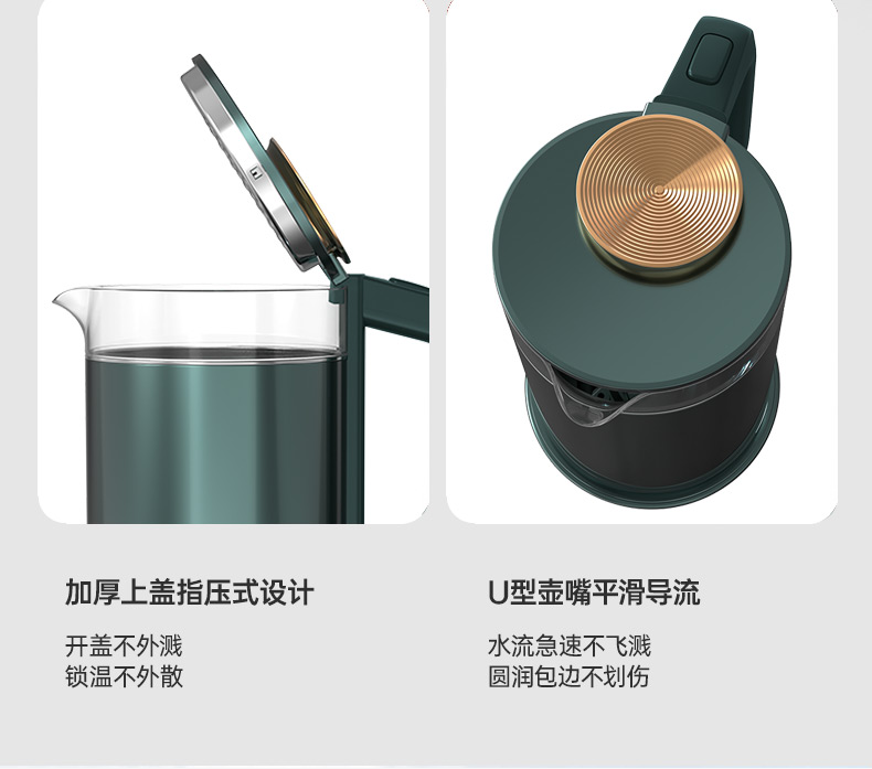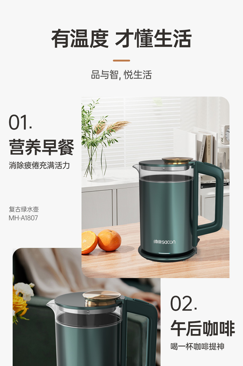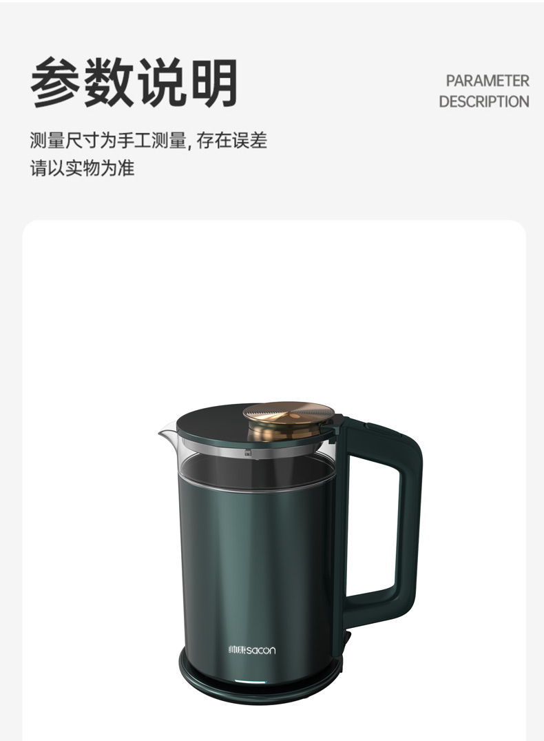 認(rèn)證型號:SSGL-17AL 顏色:綠色系 容量:1.7L 適用場景:家用 額定功率:1355W 類型:電熱水壺 特征特質(zhì):雙層防燙 功能:自動斷電防干燒