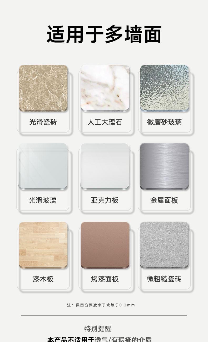 產(chǎn)品尺寸:6.5*9.2*14.3cm(配10個(gè)掛鉤) 材質(zhì):PC+TPE+ABS+AL 承重:10KG 類別:掛鉤架 適用場景:家具置物 適用墻面:光滑瓷磚,人工大理石,微磨砂玻璃,亞克力板 圖案:純色 產(chǎn)品描述:可重復(fù)使用,太空鋁材,防潮不生銹,可拼接桿體,超度隨心調(diào)