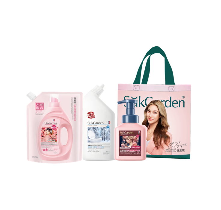 SukGarden蔬果園銀針雪松潔廁劑*800g*1 SukGarden蔬果園抑 菌洗手液(烏木玫瑰)*500ml*1 SukGarden蔬果園天然玫瑰精油香氛洗衣液(袋裝)*500g*1 蔬果園無紡布禮品袋01號-谷愛凌版*33*33*13.5cm*1