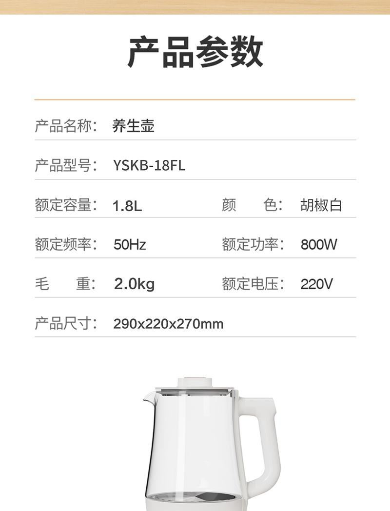 面板材質(zhì):玻璃 認證型號:YSKB-18FL 容量:1.8L 壺體材質(zhì):玻璃 顯示類型:液晶顯示 溫控器類型:國產(chǎn)溫控器 發(fā)熱方式:整圈發(fā)熱 額定功率:800W 類型:養(yǎng)生壺 功能:溫度調(diào)節(jié) 火力調(diào)節(jié) 操控方式:機械式 主色系:白色系