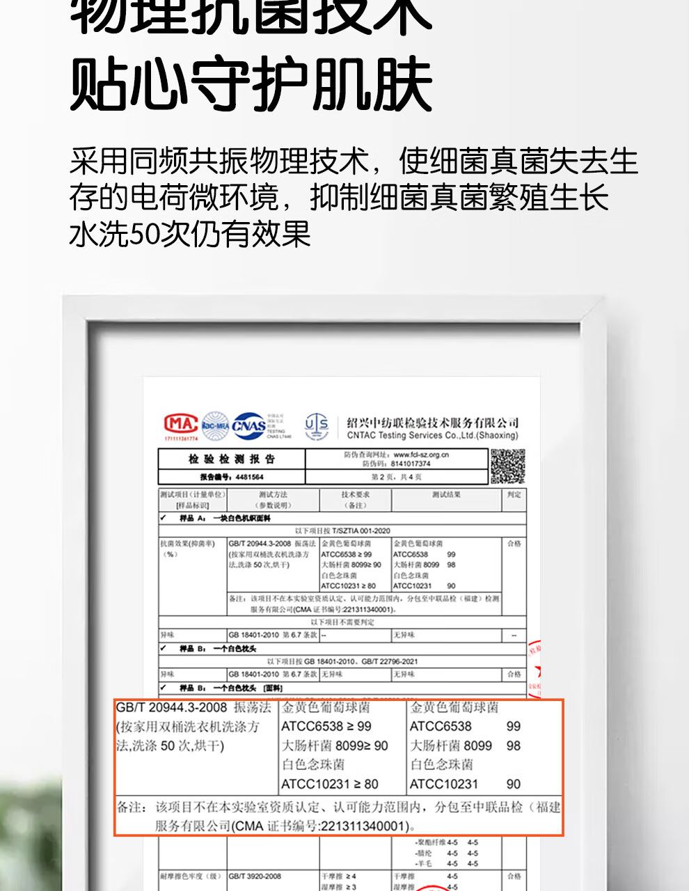 3、潔凈健康:采用同頻共振物理技術(shù),抑制細(xì)菌真菌繁殖生長(zhǎng),水洗50次仍有效果