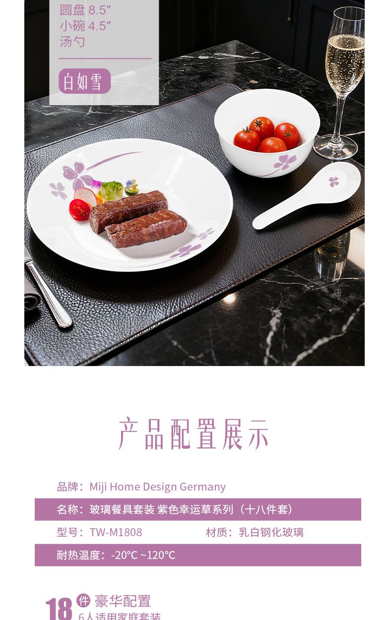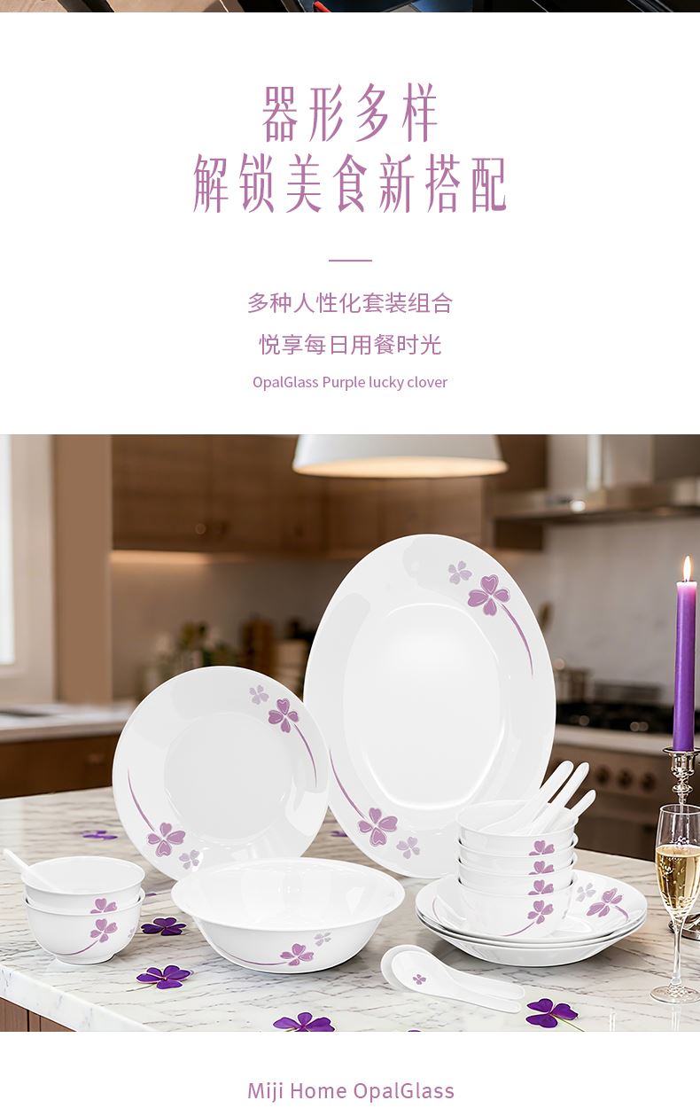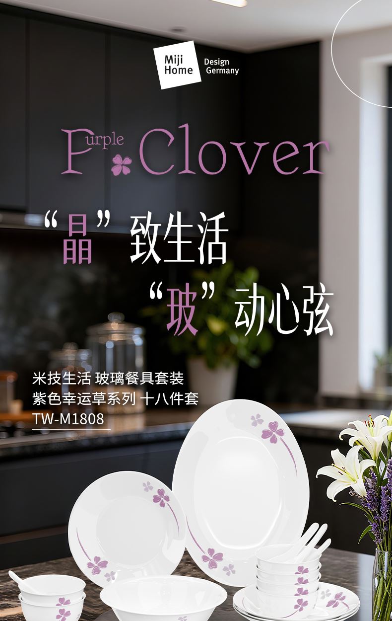 米技生活玻璃餐具套裝紫色幸運草系列(十八件套)