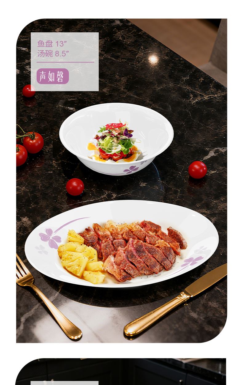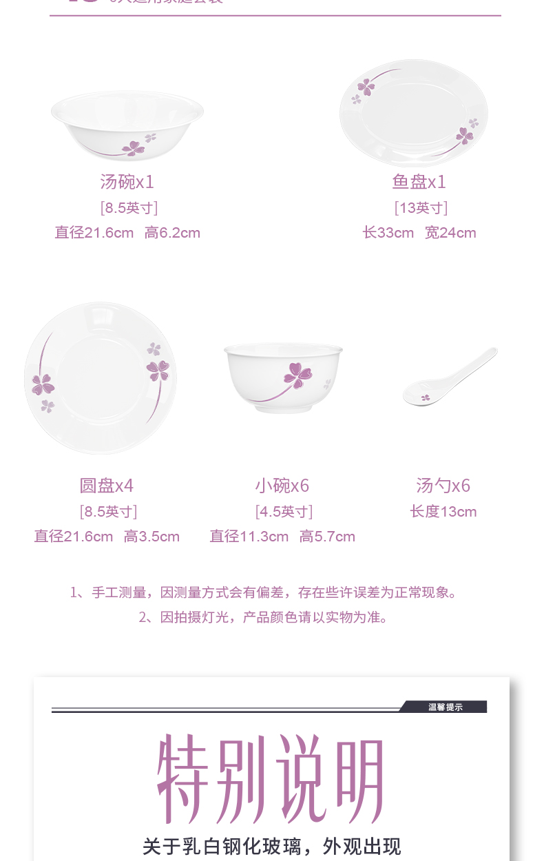 湯碗x1 [8.5英寸] 直徑21.6cm 高6.2cm 魚盤x1 [13英寸] 長33cm 寬24cm 圓盤x4 [8.5英寸] 直徑21.6cmi高3.5cm 小碗x6 [4.5英寸] 直徑11.3cm 高5.7cm 湯勺x6 長度13cm