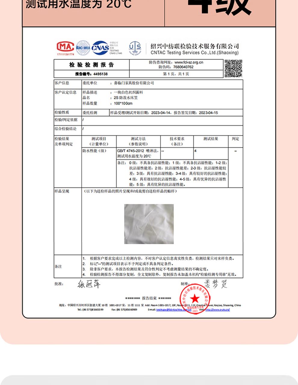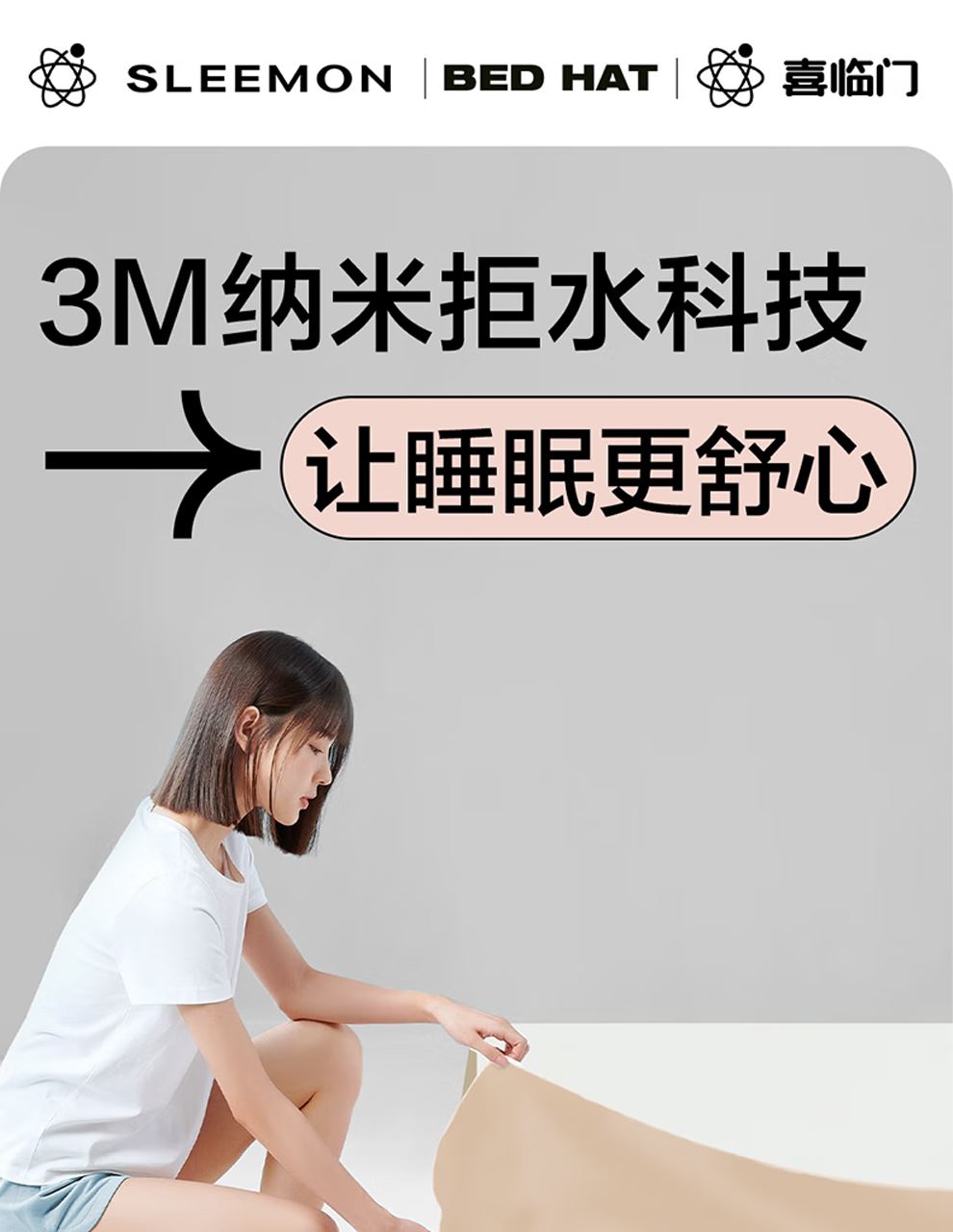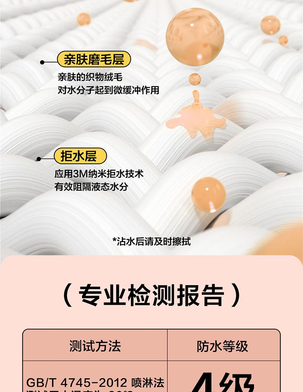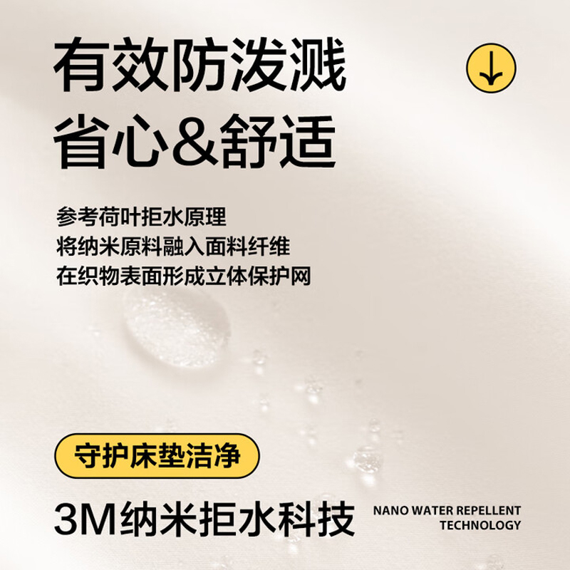 1、防水防濺:采用3M納米拒水科技,納米原料融入面料纖維形成立體保護(hù)網(wǎng),有效阻隔水分滲透,守護(hù)床墊潔凈