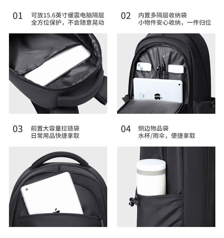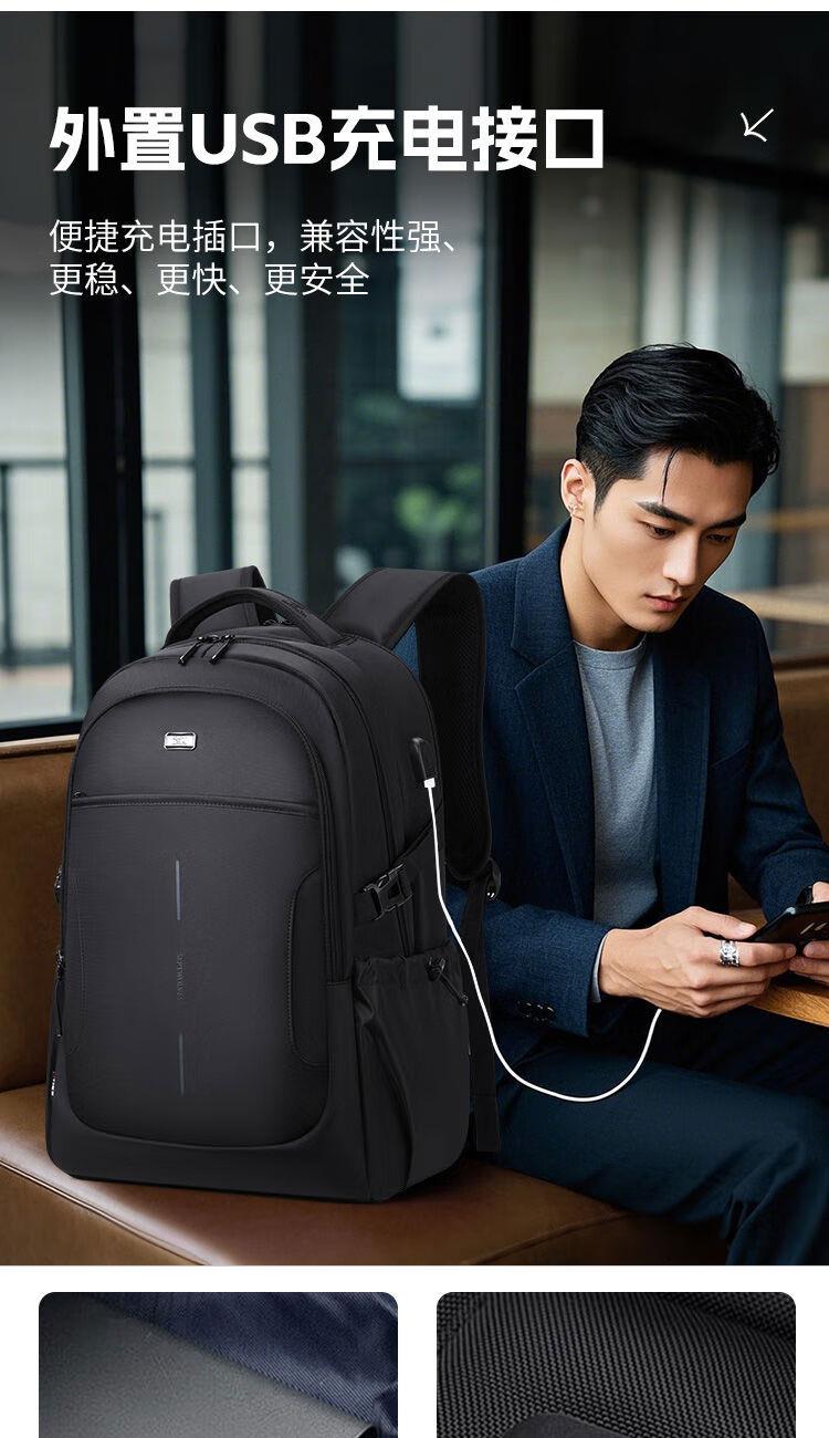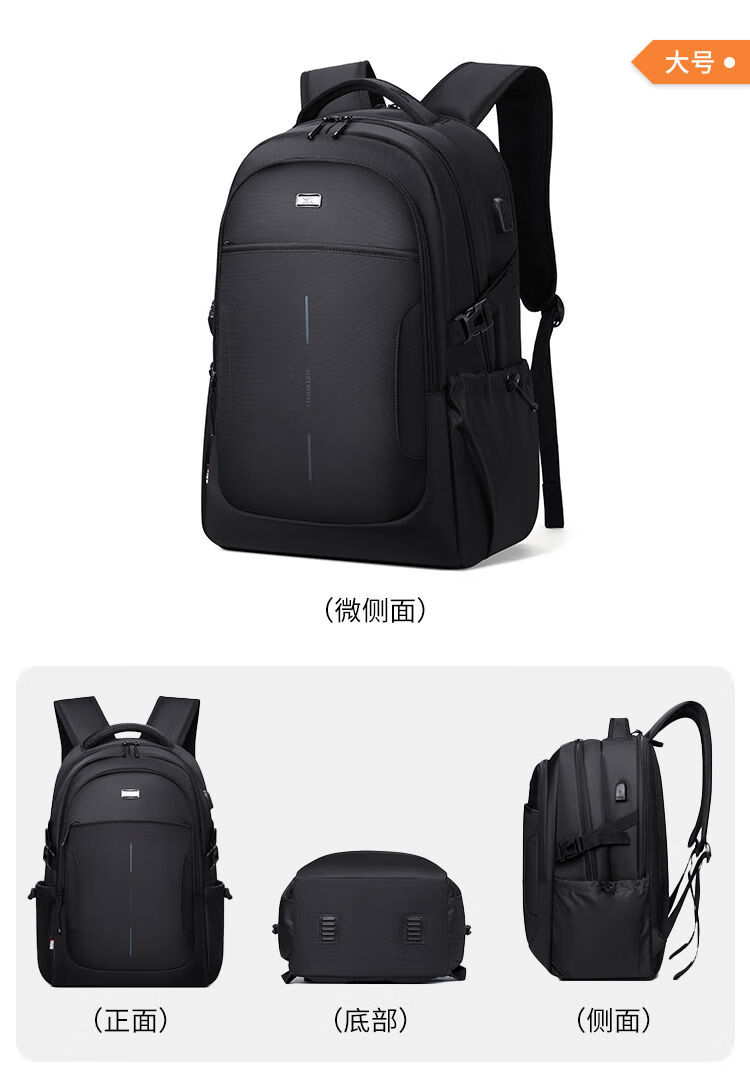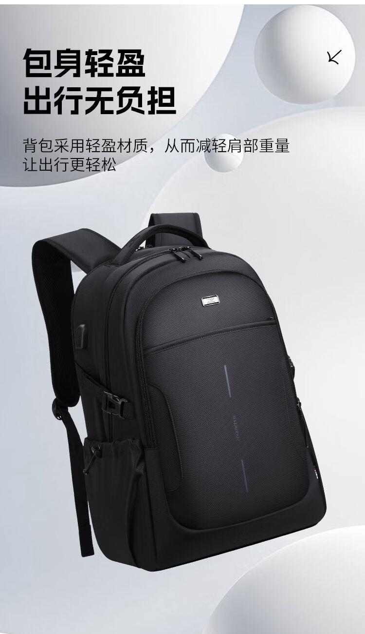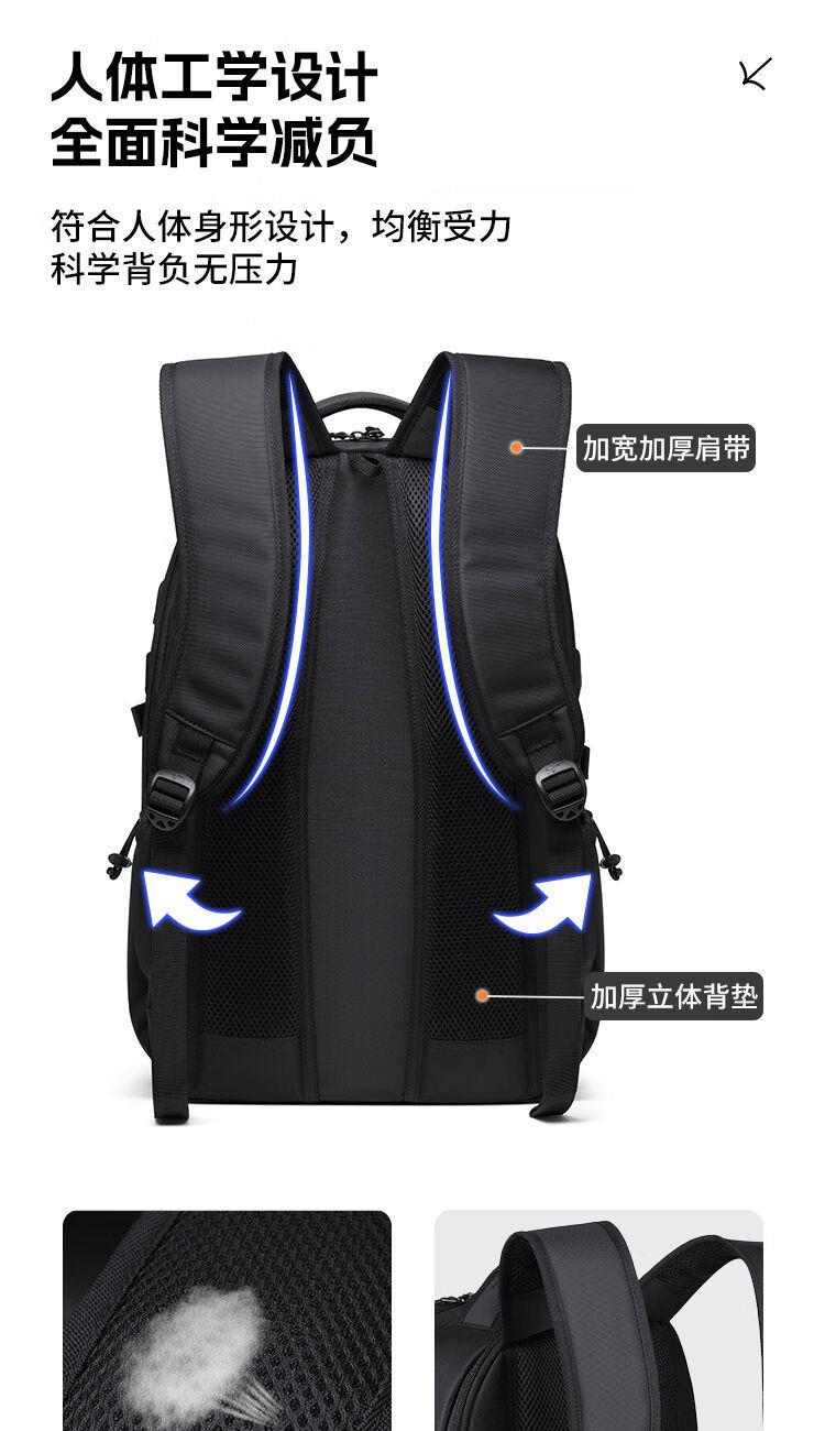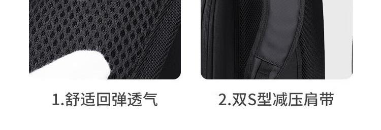 內(nèi)里大容裝載,多層收納空間,滿足多樣收納需求,輕裝出行,采用高密度織物面料,防刮耐用,防潑賤,輕松應(yīng)對潑水,便攜外置USB充電接口,3D透氣蜂窩設(shè)計,柔軟減壓肩帶