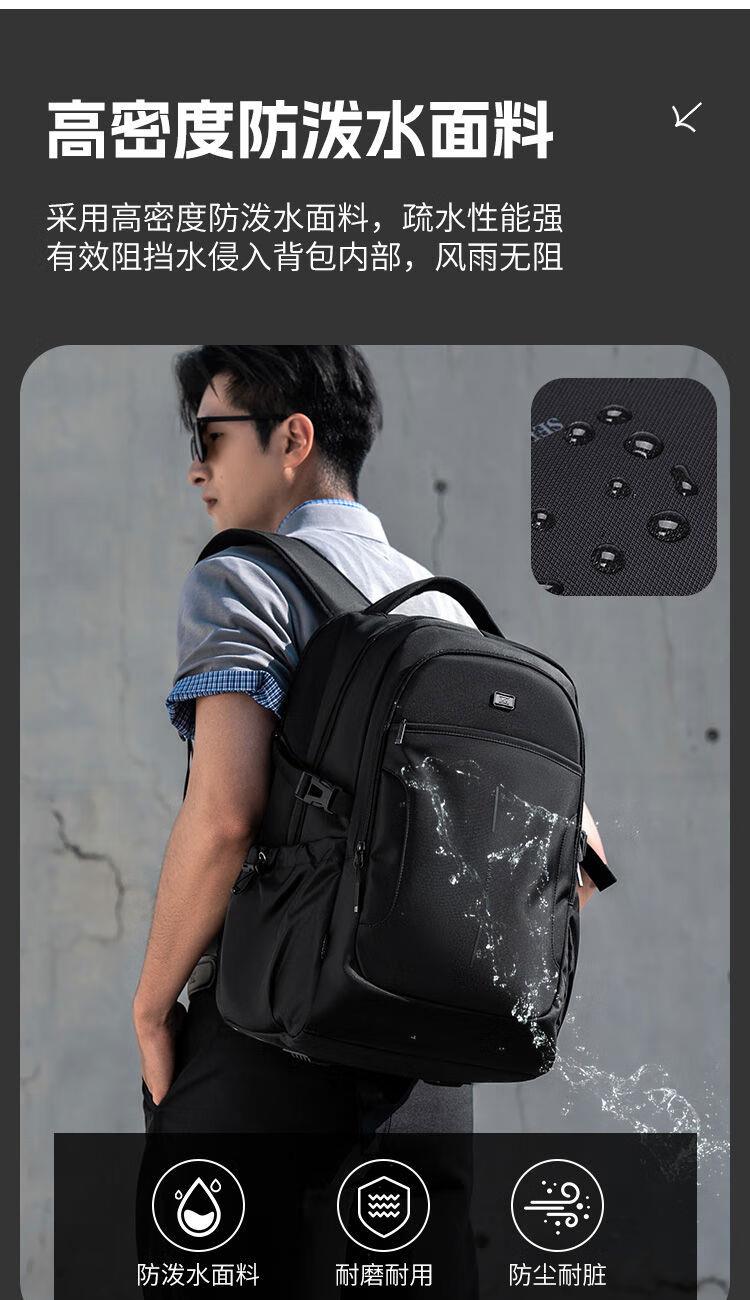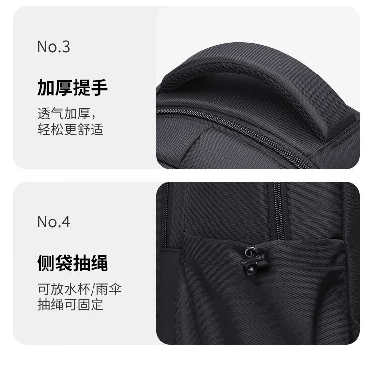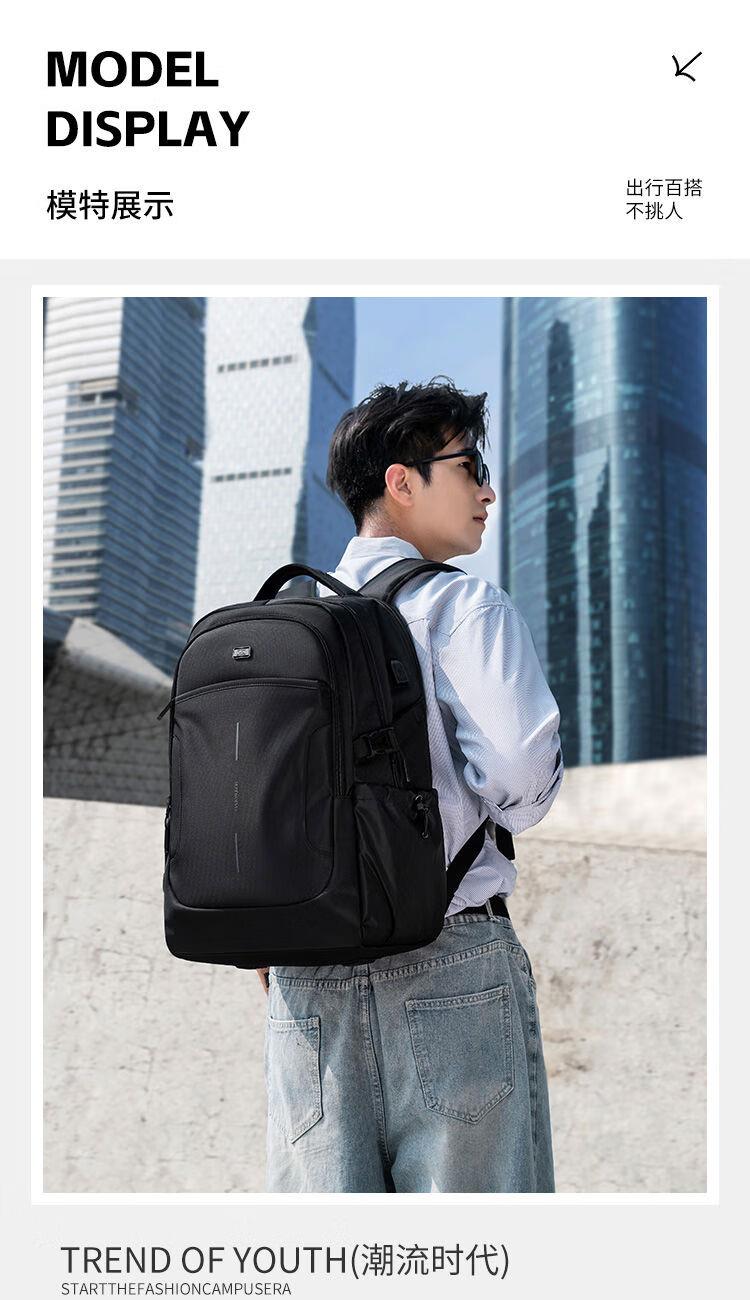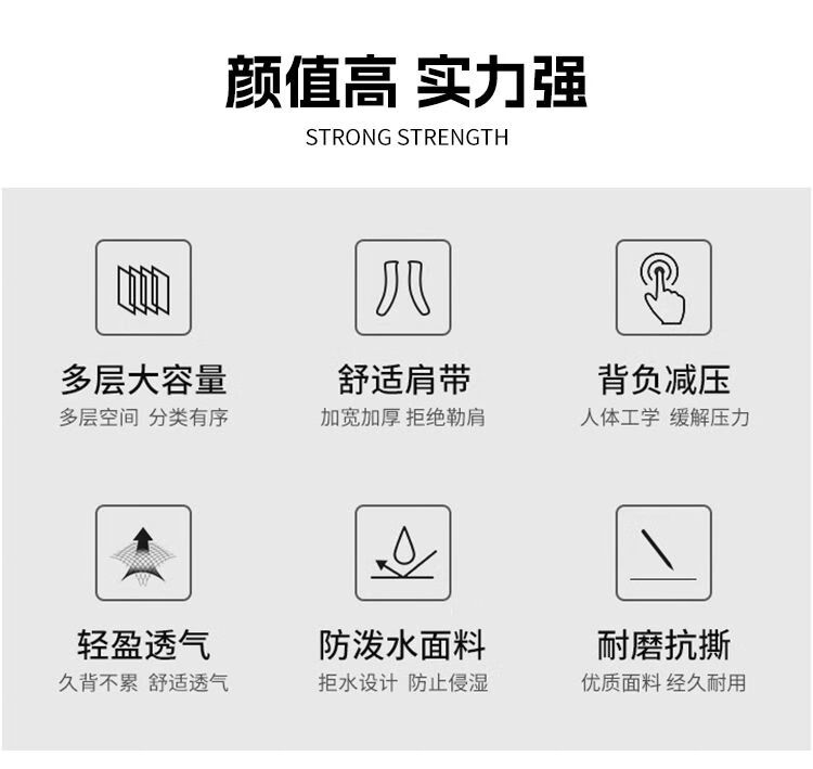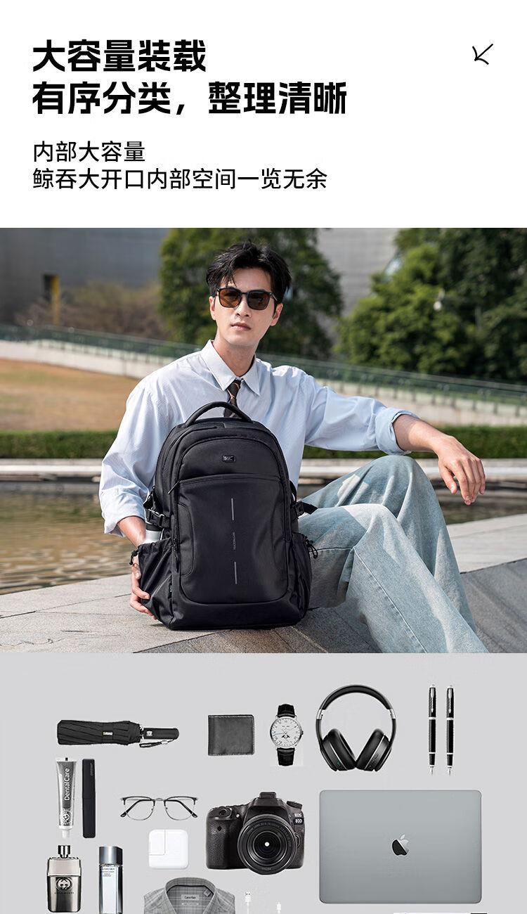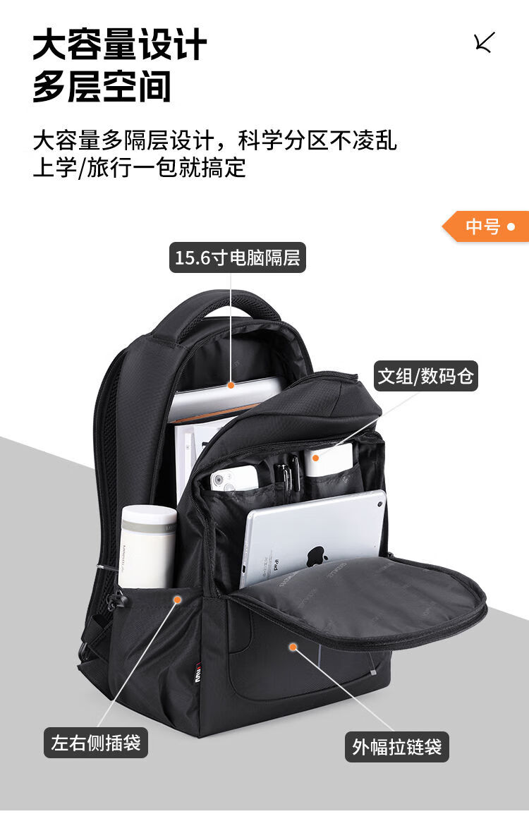 內(nèi)里大容裝載,多層收納空間,滿足多樣收納需求,輕裝出行,采用高密度織物面料,防刮耐用,防潑賤,輕松應(yīng)對潑水,便攜外置USB充電接口,3D透氣蜂窩設(shè)計,柔軟減壓肩帶