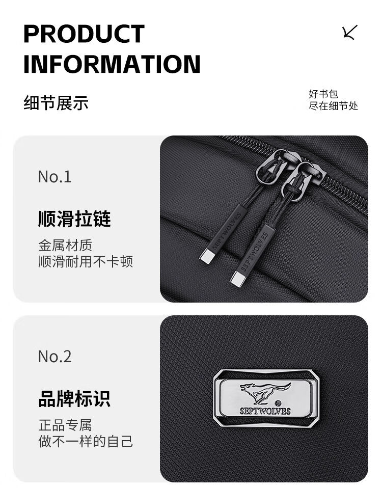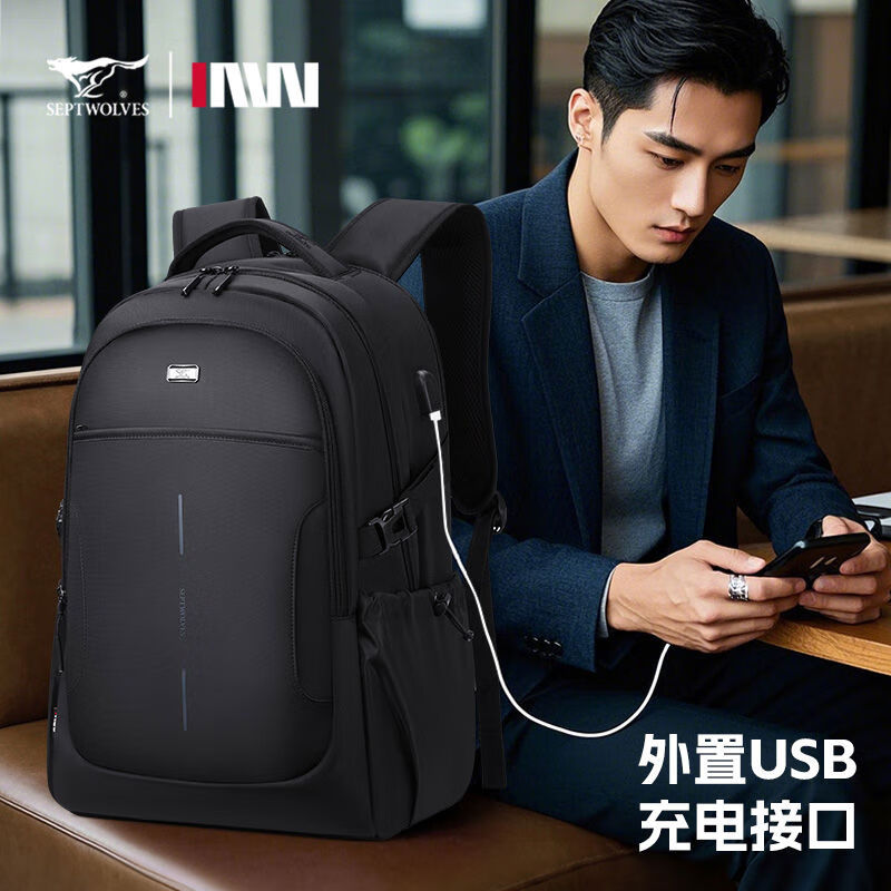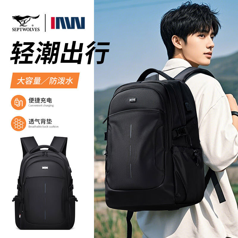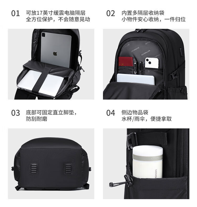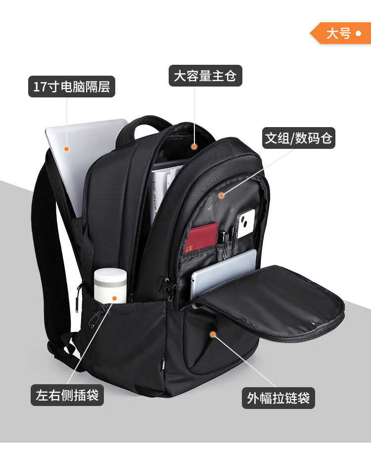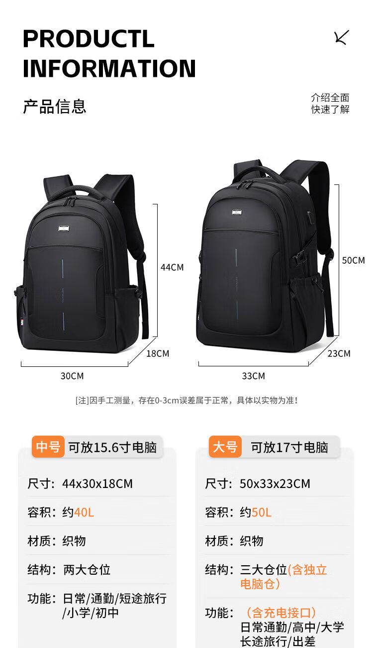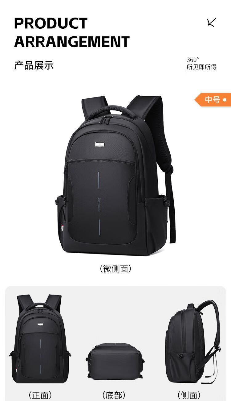 內(nèi)里大容裝載,多層收納空間,滿足多樣收納需求,輕裝出行,采用高密度織物面料,防刮耐用,防潑賤,輕松應(yīng)對潑水,便攜外置USB充電接口,3D透氣蜂窩設(shè)計,柔軟減壓肩帶