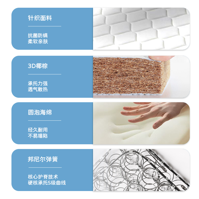 2.護(hù)脊支撐:采用邦尼爾彈簧和3D椰棕為主材,貼合亞洲人體型與脊椎結(jié)構(gòu),堅(jiān)固耐壓,支撐護(hù)脊。