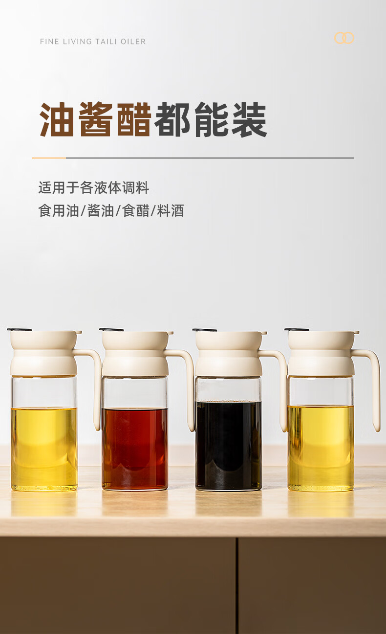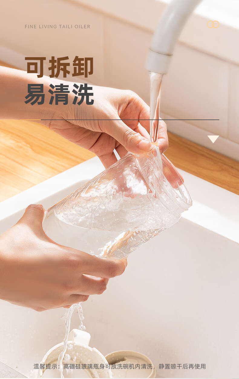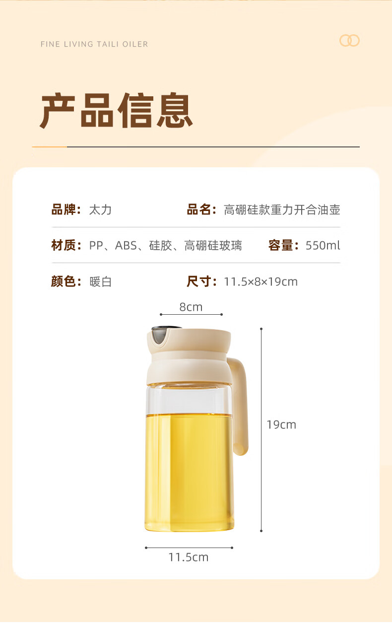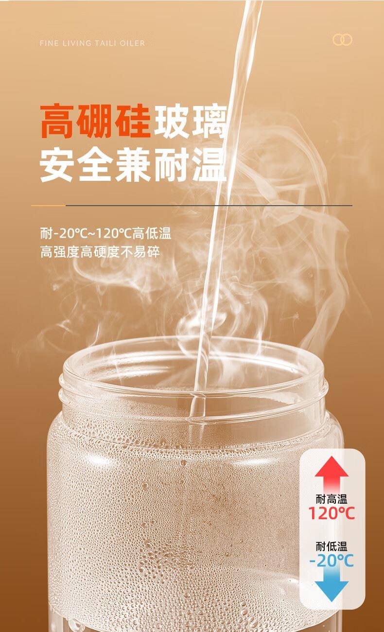 產(chǎn)品尺寸:11.5*8*19cm(1個(gè)裝) 容量:550ml 材質(zhì):PP,ABS,硅膠,高硼硅玻璃 包裝清單:高硼硅自動(dòng)開(kāi)合油壺550ml*1個(gè) 圖案:透明 功能:自動(dòng)出油,自動(dòng)回油 產(chǎn)品描述:550ml大容量,可拆卸易清洗,高硬度高強(qiáng)度高透光率