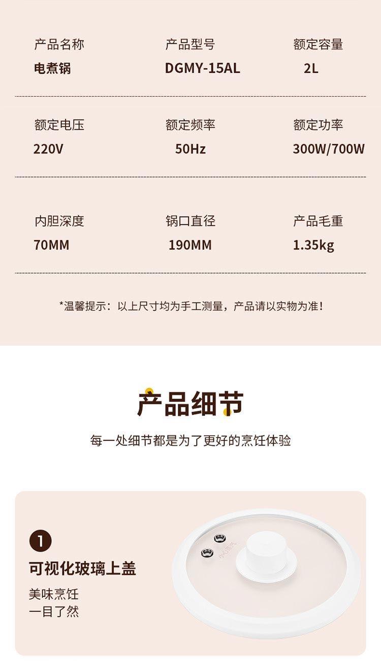 涂層材質:陶瓷釉 鍋面直徑:20cm 容量:2L 認證型號:DGMY-15AL 顏色:白色系 檔位:2檔 額定電壓:220V 電源線長:1m 額定功率:700W 類型:多功能鍋 特征特質:保溫 烤涮兩吃 操控方式:機械式